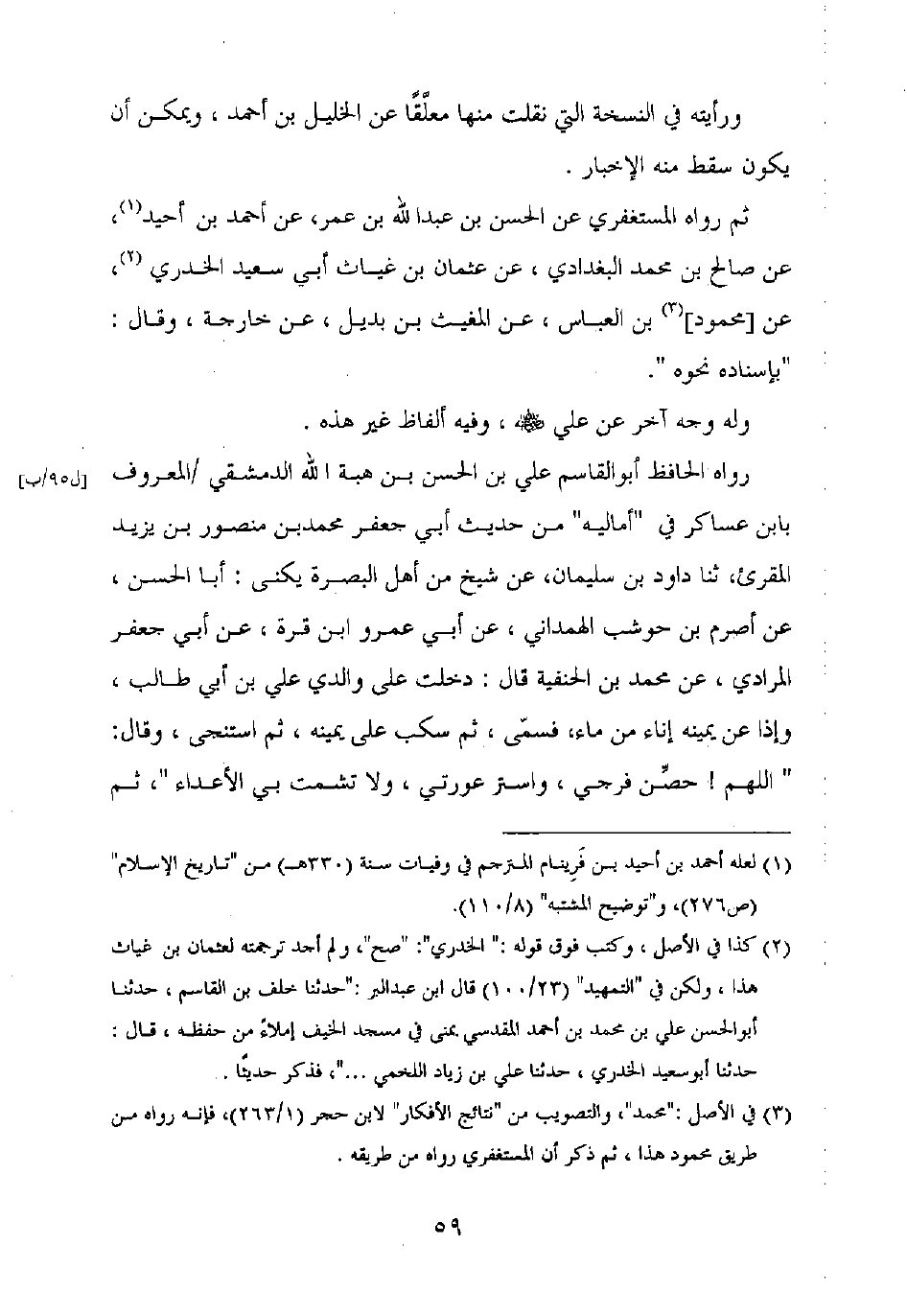 رواه الحافظ أبو القاسم علي بن الحسن بن هبة الله الدمشقي المعروف بابن عساكر في "أماليه" من حديث أبي جعفر محمد بن منصور بن يزيد المقرئ، ثنا داود بن سليمان، عن شيخ من أهل البصرة يكنى: أبا الحسن، عن أصرم بن حوشب الهمداني، عن أبي عمرو بن قرة، عن أبي جعفر المرادي، عن محمد بن الحنفية قال: دخلت على والدي علي بن أبي طالب، وإذا عن يمينه إناء من ماء، فسمى، ثم سكب على يمينه، ثم استنجى، وقال: "اللهم! حصن فرجي، واستر عورتي، ولا تشمت بي الأعداء"، ثم
