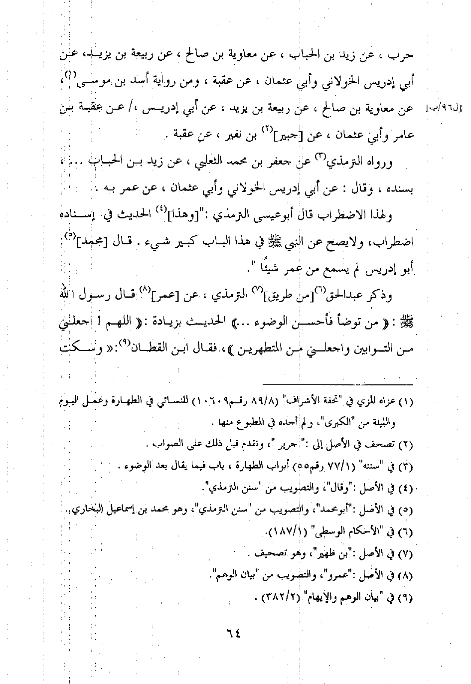 وذكر عبد الحق [من طريق] الترمذي، عن [عمر] قال رسول الله صلى الله عليه وسلم: "من توضأ فأحسن الوضوء .... " الحديث بزيادة: "اللهم! اجعلني من التوابين واجعلني من التطهرين"، فقال ابن القطان: "وسكت