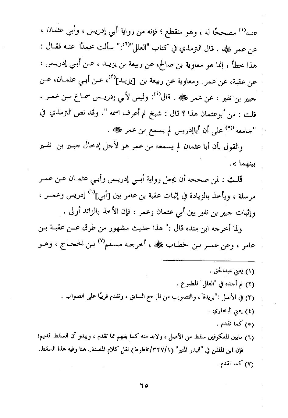 قلت: لمن صححه أن يجعل رواية أبي إدريس وأبي عثمان عن عمر مرسلة، ويأخذ بالزيادة في إثبات عقبة بن عامر بين [أبي] إدريس وعمر، وإثبات جبير بن نفير بين أبي عثمان وعمر، فإن الأخذ بالزائد أولى.