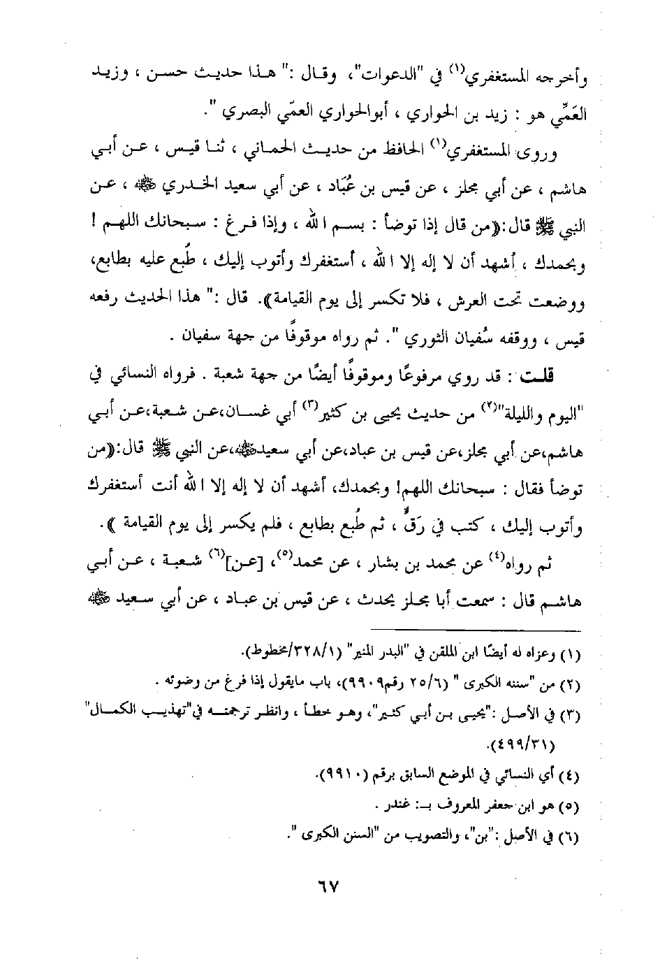 وروى المستغفري الحافظ من حديث الحماني، ثنا قيس، عن أبي هاشم، عن أبي مجلز، عن قيس بن عباد، عن أبي سعيد الخدري رضي الله عنه، عن النبي صلى الله عليه وسلم قال: "من قال إذا توضأ: بسم الله، وإذا فرغ: سبحانك اللهم! وبحمدك، أشهد ان لا إله إلا الله، أستغفرك وأتوب إليك، طبع عليه بطابع، ووضعت تحت العرش، فلا تكسر إلى يوم القيامة". قال: "هذا الحديث رفعه قيس، ووقفه سفيان الثوري". ثم رواه موقوفا من جهة سفيان.