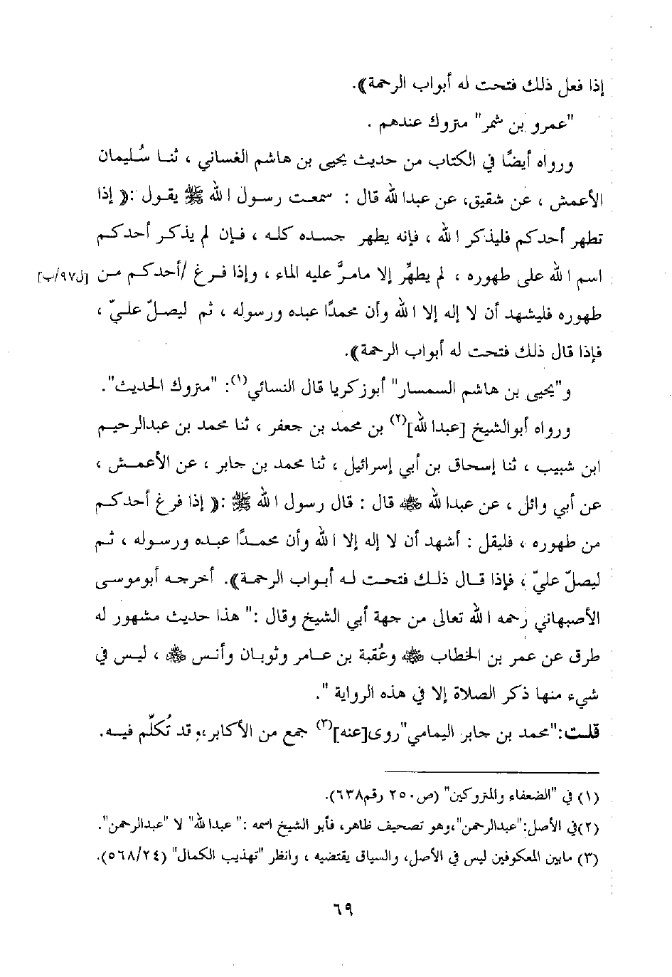 ورواه أبو الشيخ [عبد الله] بن محمد بن جعفر، ثنا محمد بن عبد الرحيم بن شبيب، ثنا إسحاق بن أبي إسرائيل، ثنا محمد بن جابر، عن الأعمش، عن أبي وائل، عن عبد الله رضي الله عنه قال: قال رسول الله صلى الله عليه وسلم: "إذا فرغ أحدكم من طهوره، فليقل: أشهد أن لا إله إلا الله وأن محمدا عبده ورسوله، ثم ليصل علي، فإذا قال ذلك فتحت له أبواب الرحمة". أخرجه أبو موسى الأصبهاني رحمه الله تعالى من جهة أبي الشيخ وقال: "هذا حديث مشهور له طرق عن عمر بن الخطاب رضي الله عنه وعقبة بن عامر وثوبان وأنس رضي الله عنه، ليس في شيء منها ذكر الصلاة إلا في هذه الرواية".