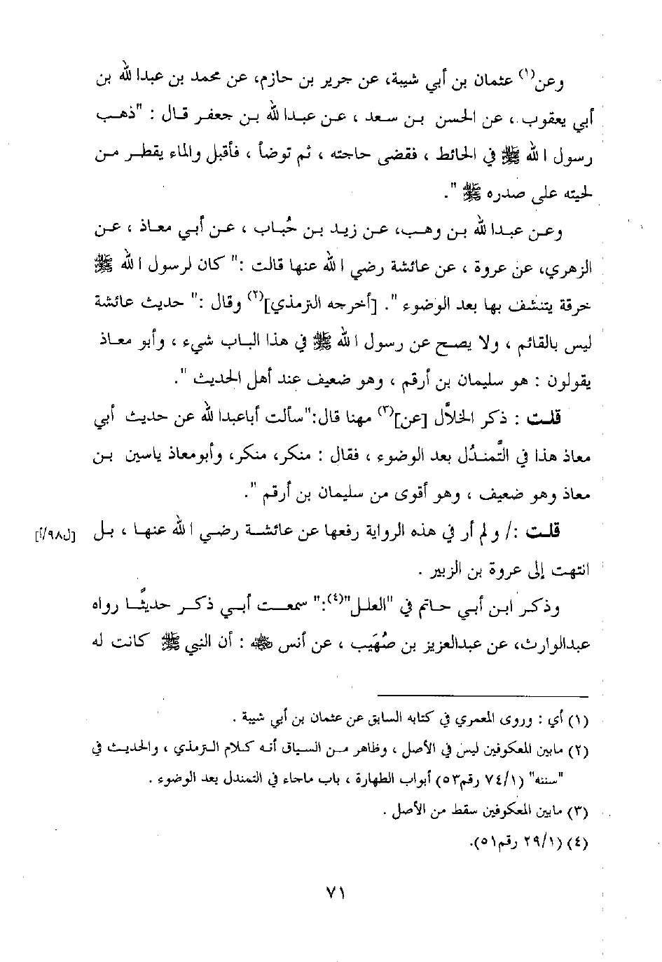 وعن عثمان بن أبي شيبة، عن جرير بن حازم، عن محمد بن عبد الله بن أبي يعقوب، عن الحسن بن سعد، عن عبد الله بن جعفر قال: "ذهب رسول الله صلى الله عليه وسلم في الحائط، فقضى حاجته، ثم توضأ، فأقبل والماء يقطر من لحيته على صدره صلى الله عليه وسلم".