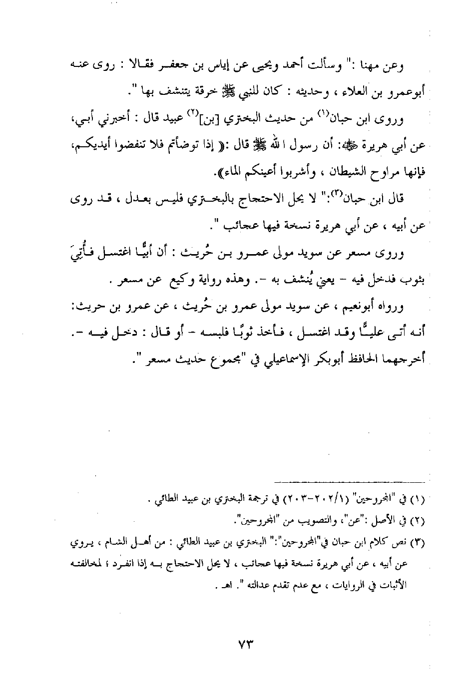 وروى ابن حبان من حديث البختري [بن] عبيد قال: أخبرني أبي، عن أبي هريرة رضي الله عنه: أن رسول الله صلى الله عليه وسلم قال: "إذا توضأتم فلا تنفضوا أيديكم، فإنها مراوح الشيطان، وأشربوا أعينكم الماء". قال ابن حبان: "لا يحل الاحتجاج بالبختري فليس بعدل، قد روى عن أبيه، عن أبي هريرة نسخة فيها عجائب".