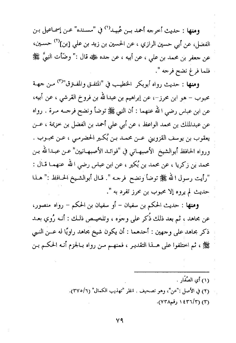 ومنها: حديث رواه أبو بكر الخطيب في "المتفق والمفترق" من جهة محبوب – هو ابن محرز –، عن إبراهيم بن عبد الله بن فروخ القرشي، عن أبيه، عن ابن عباس رضي الله عنهما: أن النبي صلى الله عليه وسلم توضأ ونضح فرجه مرة. رواه عن عبد الملك بن محمد الواعظ، عن أبي علي أحمد بن الفضل بن خزيمة، عن يعقوب بن يوسف القزويني عن محمد بن بكير الحضرمي، عن محبوب. ورواه الحافظ أبو الشيخ الأصبهاني في "فوائد الأصبهانيين" عن عبد الله بن محمد بن زكريا، عن محمد بن بكير، عن ابن عباس رضي الله عنهما قال: "رأيت رسول الله صلى الله عليه وسلم توضأ ونضح فرجه". قال أبو الشيخ الحافظ: "هذا حديث لم يروه إلا محبوب بن محرز تفرد به".