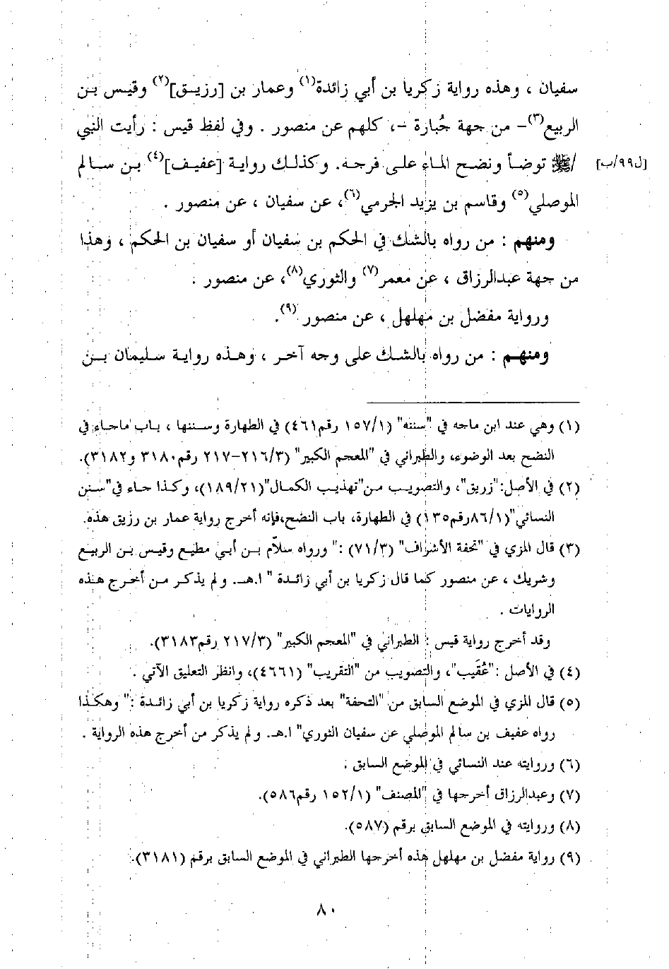 سفيان، وهذه رواية زكريا بن أبي زائدة وعمار بن [رزيق] وقيس بن الربيع – من جهة جبارة –، كلهم عن منصور. وفي لفظ قيس: رأيت النبي صلى الله عليه وسلم توضأ ونضح الماء على فرجه. وكذلك رواية [عفيف] بن سالم الموصلي وقاسم بن يزيد الجرمي، عن سفيان، عن منصور.