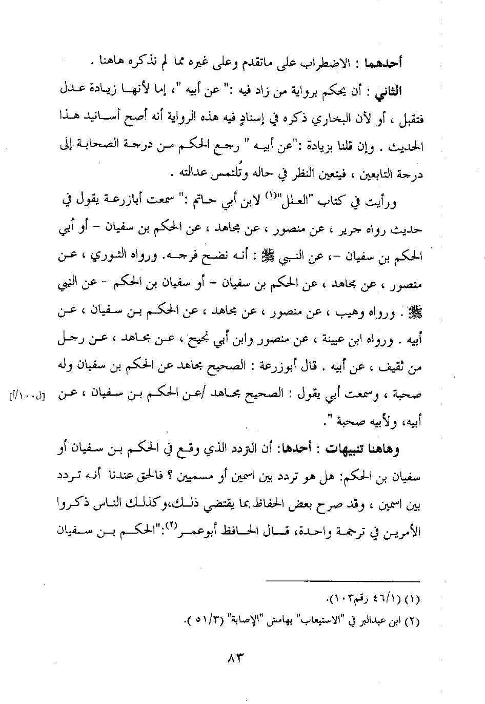 وهاهنا تنبيهات: أحدها: أن التردد الذي وقع في الحكم بن سفيان أو سفيان بن الحكم: هل هو تردد بين اسمين أو مسميين؟ فالحق عندنا أنه تردد بين اسمين، وقد صرح بعض الحفاظ بما يقتضي ذلك، وكذلك الناس ذكروا الأمرين في ترجمة واحدة، قال الحافظ أبو عمر: "الحكم بن سفيان