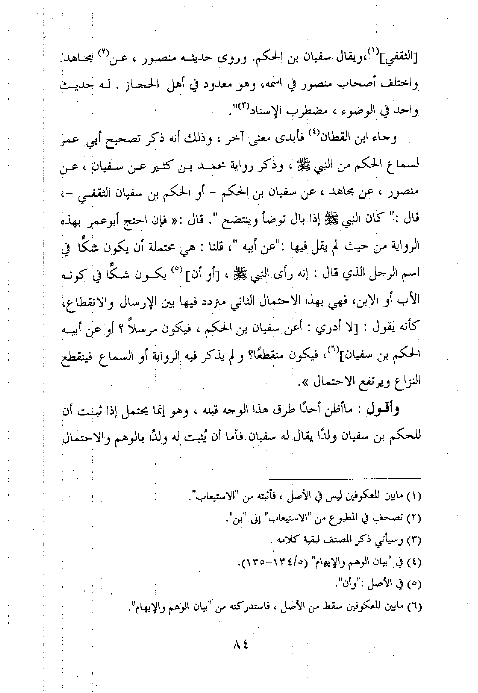 وجاء ابن القطان فأبدى معنى آخر، وذلك أنه ذكر تصحيح أبي عمر لسماع الحكم من النبي صلى الله عليه وسلم، وذكر رواية محمد بن كثير عن سفيان، عن منصور، عن مجاهد، عن سفيان بن الحكم – أو الحكم بن سفيان الثقفي –، قال: "كان النبي صلى الله عليه وسلم إذا بال توضأ وينتضح". قال: "فإن احتج أبو عمر بهذه الرواية من حيث لم يقل فيها: " عن أبيه "، قلنا: هي محتملة أن يكون شكا في اسم الرجل الذي قال: إنه رأى النبي صلى الله عليه وسلم، [أو أن] يكون شكا في كونه الأب أو الابن، فهي بهذا الاحتمال الثاني متردد فيها بين الإرسال والانقطاع، كأنه يقول: [لا أدري: أعن سفيان بن الحكم، فيكون مرسلا؟ أو عن أبيه الحكم بن سفيان]، فيكون منقطعا؟ ولم يذكر فيه الرواية أو السماع فينقطع النزاع ويرتفع الاحتمال ".