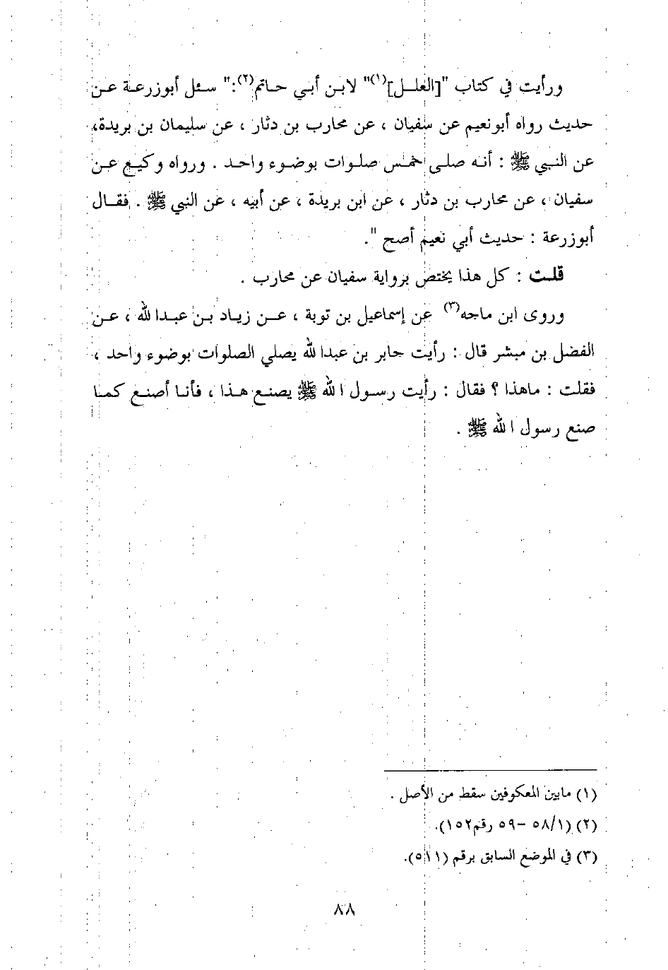 ورأيت في كتاب " [العلل] " لابن أبي حاتم: "سئل أبو زرعة عن حديث رواه أبو نعيم عن سفيان، عن محارب بن دثار، عن سليمان بن بريدة، عن النبي صلى الله عليه وسلم: أنه صلى خمس صلوات بوضوء واحد. ورواه وكيع عن سفيان، عن محارب بن دثار، عن ابن بريدة، عن أبيه، عن النبي صلى الله عليه وسلم. فقال أبو زرعة: حديث أبي نعيم أصح".