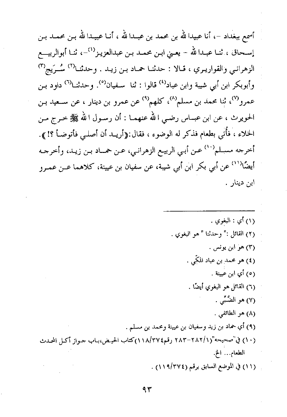 أسمع ببغداد –، أنا عبيد الله بن محمد بن عبد الله، أنا عبيد الله بن محمد بن إسحاق، ثنا عبد الله – يعني ابن محمد بن عبد العزيز –، ثنا أبو الربيع الزهراني والقواريري، قالا: حدثنا حماد بن زيد. وحدثنا سريج وأبو بكر ابن أبي شيبة وابن عباد قالوا: ثنا سفيان. وحدثنا داود بن عمرو، ثنا محمد بن مسلم، كلهم عن عمرو بن دينار، عن سعيد بن الحويرث، عن ابن عباس رضي الله عنهما: أن رسول الله صلى الله عليه وسلم خرج من الخلاء، فأتي بطعام فذكر له الوضوء، فقال: "أريد أن أصلي فأتوضأ؟! ".