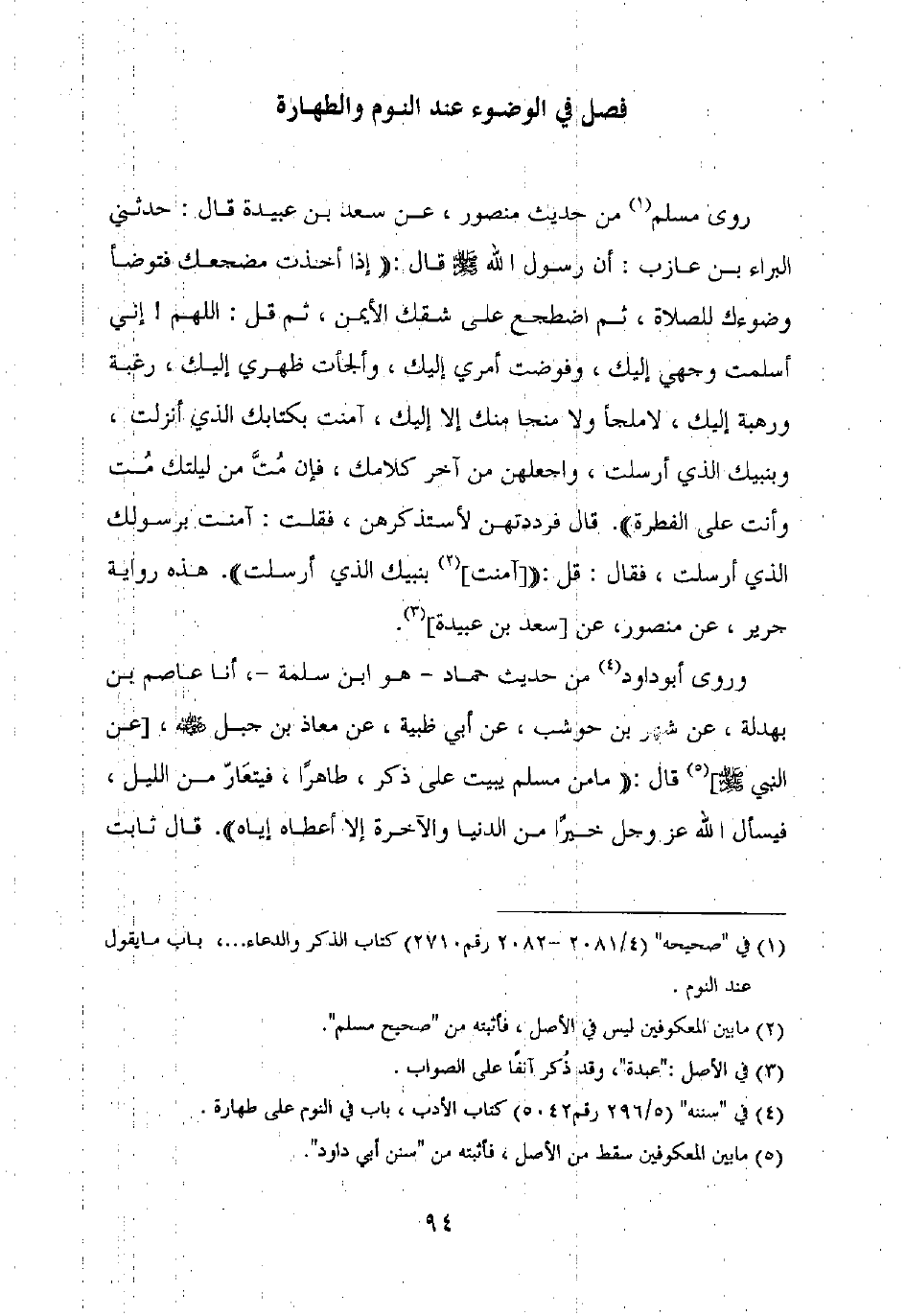 روى مسلم من حديث منصور، عن سعد بن عبيدة قال: حدثني البراء بن عازب: أن رسول الله صلى الله عليه وسلم قال: "إذا أخذت مضجعك فتوضأ وضوءك للصلاة، ثم اضطجع على شقك الأيمن، ثم قل: اللهم! إني أسلمت وجهي إليك، وفوضت أمري إليك، وألجأت ظهري إليك، رغبة ورهبة إليك، لا ملجأ ولا منجا منك إلا إليك، آمنت بكتابك الذي أنزلت، وبنبيك الذي أرسلت، واجعلهن من آخر كلامك، فإن مت من ليلتك مت وأنت على الفطرة". قال فرددتهن لأستذكرهن، فقلت: آمنت برسولك الذي أرسلت، فقال: قل: " [آمنت] بنبيك الذي أرسلت". هذه رواية جرير، عن منصور، عن [سعد بن عبيدة].