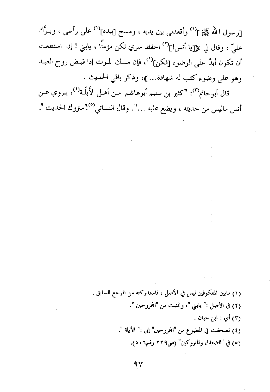 [رسول الله صلى الله عليه وسلم] وأقعدني بين يديه، ومسح [بيده] على رأسي، وبرك علي، وقال لي: " [يا أنس!] احفظ سري تكن مؤمنا، يابني! إن استطعت أن تكون أبدا على الوضوء [فكن]، فإن ملك الموت إذا قبض روح العبد وهو على وضوء كتب له شهادة ... "، وذكر باقي الحديث.