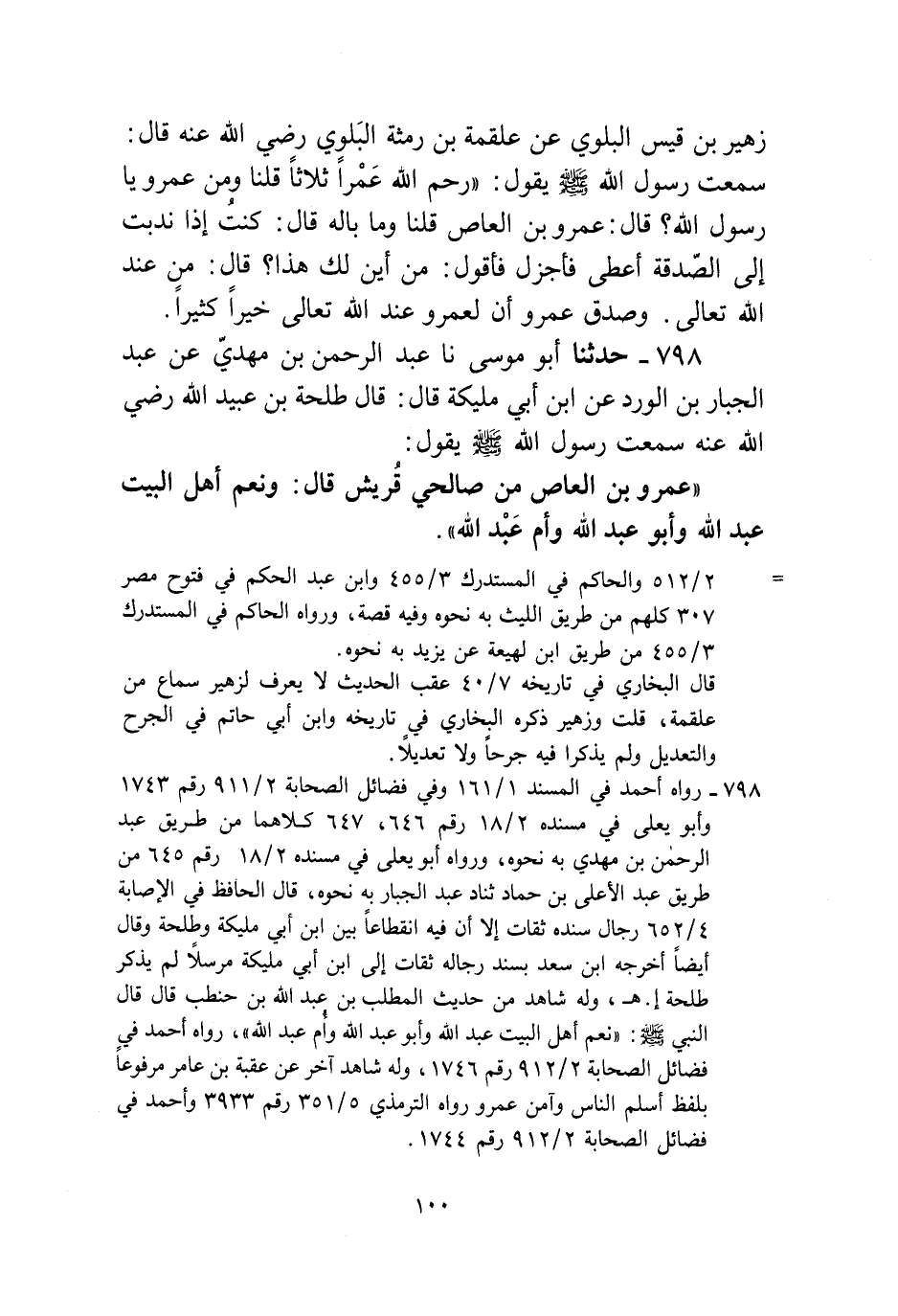 798 - حَدَّثَنَا أَبُو مُوسَى، نا عَبْدُ الرَّحْمَنِ بْنُ مَهْدِيٍّ، عَنْ عَبْدِ الْجَبَّارِ بْنِ الْوَرْدِ، عَنِ ابْنِ أَبِي مُلَيْكَةَ، قَالَ طَلْحَةُ بْنُ عُبَيْدِ اللَّهِ رَضِيَ اللَّهُ عَنْهُ: سَمِعْتُ رَسُولَ اللَّهِ صَلَّى اللهُ عَلَيْهِ وَسَلَّمَ يَقُولُ: «§عَمْرُو بْنُ الْعَاصِ مِنْ صَالِحِي قُرَيْشٍ» ، قَالَ: «وَنِعْمَ أَهْلُ الْبَيْتِ عَبْدُ اللَّهِ، وَأَبُو عَبْدِ اللَّهِ، وَأُمُّ عَبْدِ اللَّهِ»