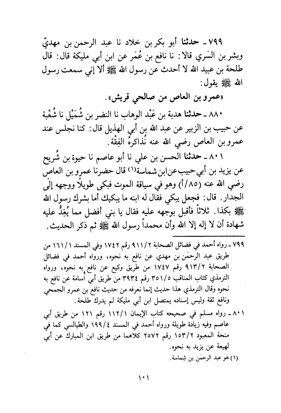 799 - حَدَّثَنَا أَبُو بَكْرِ بْنُ خَلَّادٍ، نا عَبْدُ الرَّحْمَنِ بْنُ مَهْدِيٍّ، وَبَشْرُ بْنُ السَّرِيِّ، قَالَا: نا نَافِعُ بْنُ عُمَرَ، عَنِ ابْنِ أَبِي مُلَيْكَةَ قَالَ: قَالَ طَلْحَةُ بْنُ عُبَيْدِ اللَّهِ: لَا أُحَدِّثُ عَنْ رَسُولِ اللَّهِ صَلَّى اللهُ عَلَيْهِ وَسَلَّمَ، أَلَا إِنِّي سَمِعْتُ رَسُولَ اللَّهِ صَلَّى اللهُ عَلَيْهِ وَسَلَّمَ يَقُولُ: «§عَمْرُو بْنُ الْعَاصِ مِنْ صَالِحِي قُرَيْشٍ»