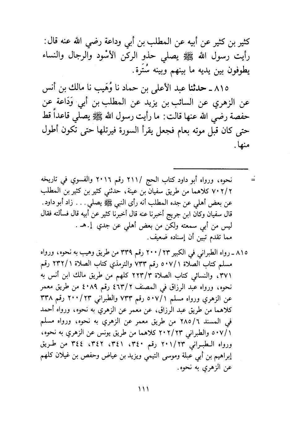 815 - حَدَّثَنَا عَبْدُ الْأَعْلَى بْنُ حَمَّادٍ، نا وُهَيْبٌ، نا مَالِكُ بْنُ أَنَسٍ، عَنِ الزُّهْرِيِّ، عَنِ السَّائِبِ بْنِ يَزِيدَ، عَنِ الْمُطَّلِبِ بْنِ أَبِي وَدَاعَةَ، عَنْ حَفْصَةَ رَضِيَ اللَّهُ عَنْهَا قَالَتْ: «§مَا رَأَيْتُ رَسُولَ اللَّهِ صَلَّى اللهُ عَلَيْهِ وَسَلَّمَ يُصَلِّي قَاعِدًا قَطُّ، حَتَّى كَانَ قَبْلَ مَوْتِهِ بِعَامٍ، فَجَعَلَ يَقْرَأُ السُّورَةَ فَيُرَتِّلُهَا حَتَّى تَكُونَ أَطْوَلَ مِنْهَا»