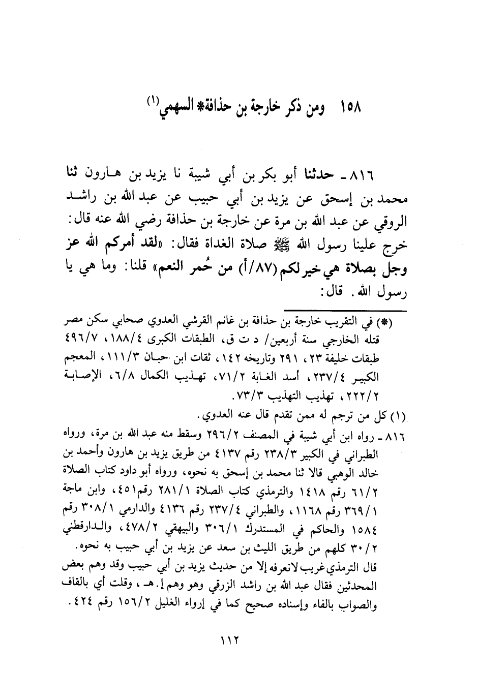 816 - حَدَّثَنَا أَبُو بَكْرِ بْنُ أَبِي شَيْبَةَ، نا يَزِيدُ بْنُ هَارُونَ، ثنا مُحَمَّدُ بْنُ إِسْحَاقَ، عَنْ يَزِيدَ بْنِ أَبِي حَبِيبٍ، عَنْ عَبْدِ اللَّهِ بْنِ رَاشِدٍ الزَّوْفِيِّ، عَنْ عَبْدِ اللَّهِ بْنِ مُرَّةَ، عَنْ خَارِجَةَ بْنِ حُذَافَةَ رَضِيَ اللَّهُ عَنْهُ قَالَ: خَرَجَ عَلَيْنَا رَسُولُ اللَّهِ صَلَّى اللهُ عَلَيْهِ وَسَلَّمَ صَلَاةَ الْغَدَاةِ فَقَالَ: «لَقَدْ §أَمْرَكُمُ اللَّهُ عَزَّ وَجَلَّ بِصَلَاةٍ هِيَ خَيْرٌ لَكُمْ مِنْ حُمْرِ النَّعَمِ» ، قُلْنَا: وَمَا هِيَ يَا رَسُولَ اللَّهِ؟ قَالَ -[113]-: «الْوِتْرُ فِيمَا بَيْنَ صَلَاةِ الْعِشَاءِ إِلَى طُلُوعِ الْفَجْرِ» قَالَ ابْنُ أَبِي عَاصِمٍ: وَفِيهِ نَفْيُ قَضَاءِ الْوِتْرِ بَعْدَ الْفَجْرِ مُوَافِقٌ لِرِوَايَةِ ابْنِ عُمَرَ رَضِيَ اللَّهُ عَنْهُ، عَنِ النَّبِيِّ صَلَّى اللهُ عَلَيْهِ وَسَلَّمَ: «إِذَا طَلَعَ الْفَجْرُ فَلَا صَلَاةَ لَيْلٍ وَلَا وُتْرَ»