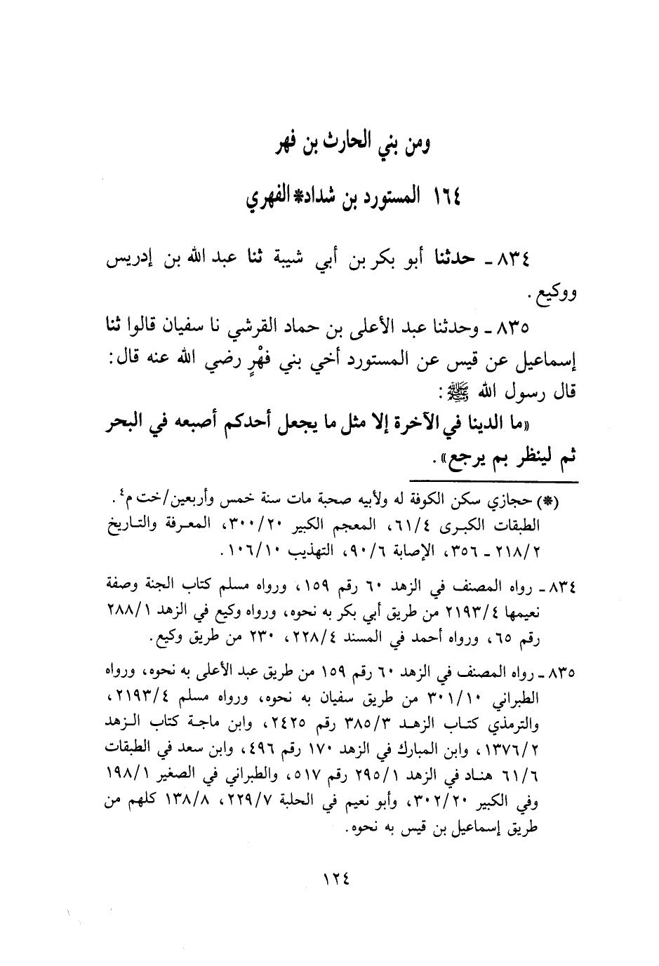 835 - وَحَدَّثَنَا عَبْدُ الْأَعْلَى بْنُ حَمَّادٍ الْقُرَشِيُّ، نا سُفْيَانُ، قَالُوا: ثنا إِسْمَاعِيلُ، عَنْ قَيْسٍ، عَنِ الْمُسْتَوْرِدِ أَخِي بَنِي فِهْرٍ رَضِيَ اللَّهُ عَنْهُ قَالَ: قَالَ رَسُولُ اللَّهِ صَلَّى اللهُ عَلَيْهِ وَسَلَّمَ: «§مَا الدُّنْيَا فِي الْآخِرَةِ إِلَّا مِثْلَ مَا يَجْعَلُ أَحَدُكُمْ أُصْبَعَهُ فِي الْبَحْرِ، ثُمَّ لَيَنْظُرْ بِمَ يَرْجِعُ» -[125]-،