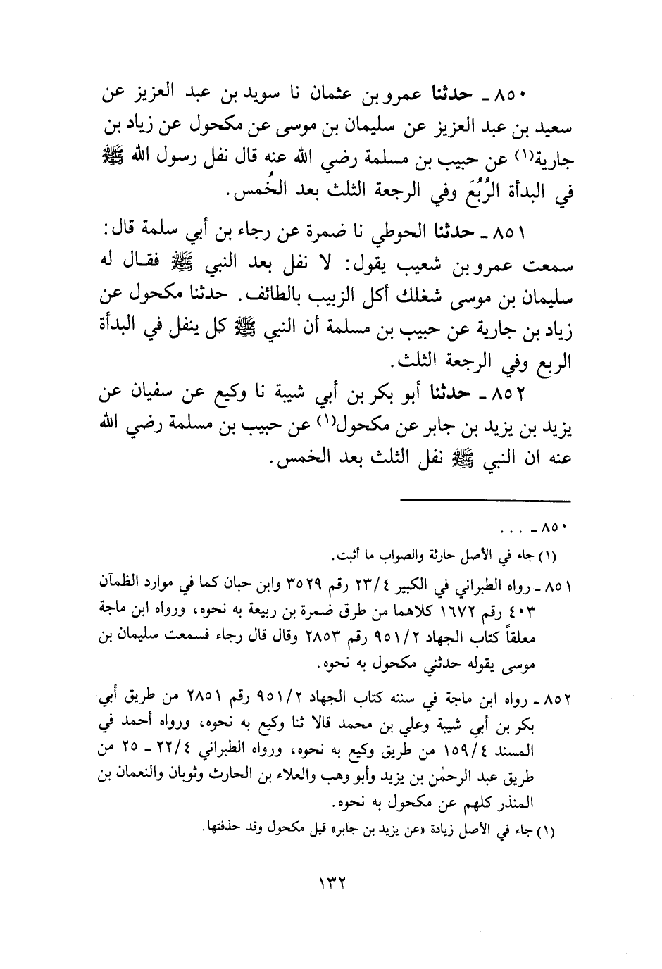 850 - حَدَّثَنَا عَمْرُو بْنُ عُثْمَانَ، نا سُوَيْدُ بْنُ عَبْدِ الْعَزِيزِ، عَنْ سَعِيدِ بْنِ عَبْدِ الْعَزِيزِ، عَنْ سُلَيْمَانَ بْنِ مُوسَى، عَنْ مَكْحُولٍ، عَنْ زِيَادِ بْنِ جَارِيَةَ، عَنْ حَبِيبِ بْنِ مَسْلَمَةَ رَضِيَ اللَّهُ عَنْهُ قَالَ: «§نَفَلَ رَسُولُ اللَّهِ صَلَّى اللهُ عَلَيْهِ وَسَلَّمَ فِي الْبَدْأَةِ الرُّبُعَ، وَفِي الرَّجْعَةِ الثُّلُثَ بَعْدَ الْخُمُسِ»