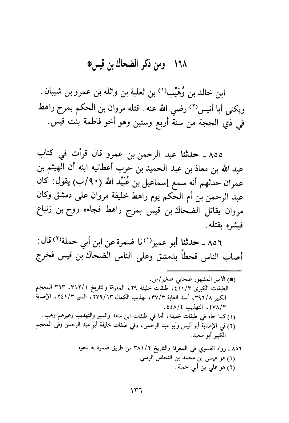 855 - حَدَّثَنَا عَبْدُ الرَّحْمَنِ بْنُ عَمْرٍو، قَالَ: قَرَأْتُ فِي كِتَابِ عَبْدِ اللَّهِ بْنِ مُعَاذِ بْنِ عَبْدِ الْحَمِيدِ بْنِ حَرْبٍ أَعْطَانِيهِ ابْنُهُ، أَنَّ الْهَيْثَمَ بْنَ عِمْرَانَ حَدَّثَهُمْ أَنَّهُ سَمِعَ إِسْمَاعِيلَ بْنَ عُبَيْدِ اللَّهِ يَقُولُ: «§كَانَ عَبْدُ الرَّحْمَنِ بْنُ أُمِّ الْحَكَمِ يَوْمَ رَاهِطٍ خَلِيفَةَ مَرْوَانَ عَلَى دِمَشْقَ، وَكَانَ مَرْوَانُ يُقَاتِلُ الضَّحَّاكَ بْنَ قَيْسٍ بِمَرْجِ رَاهِطٍ، فَجَاءَهُ رَوْحُ بْنُ زِنْبَاعٍ فَبَشَّرَهُ بِقَتْلِهِ»