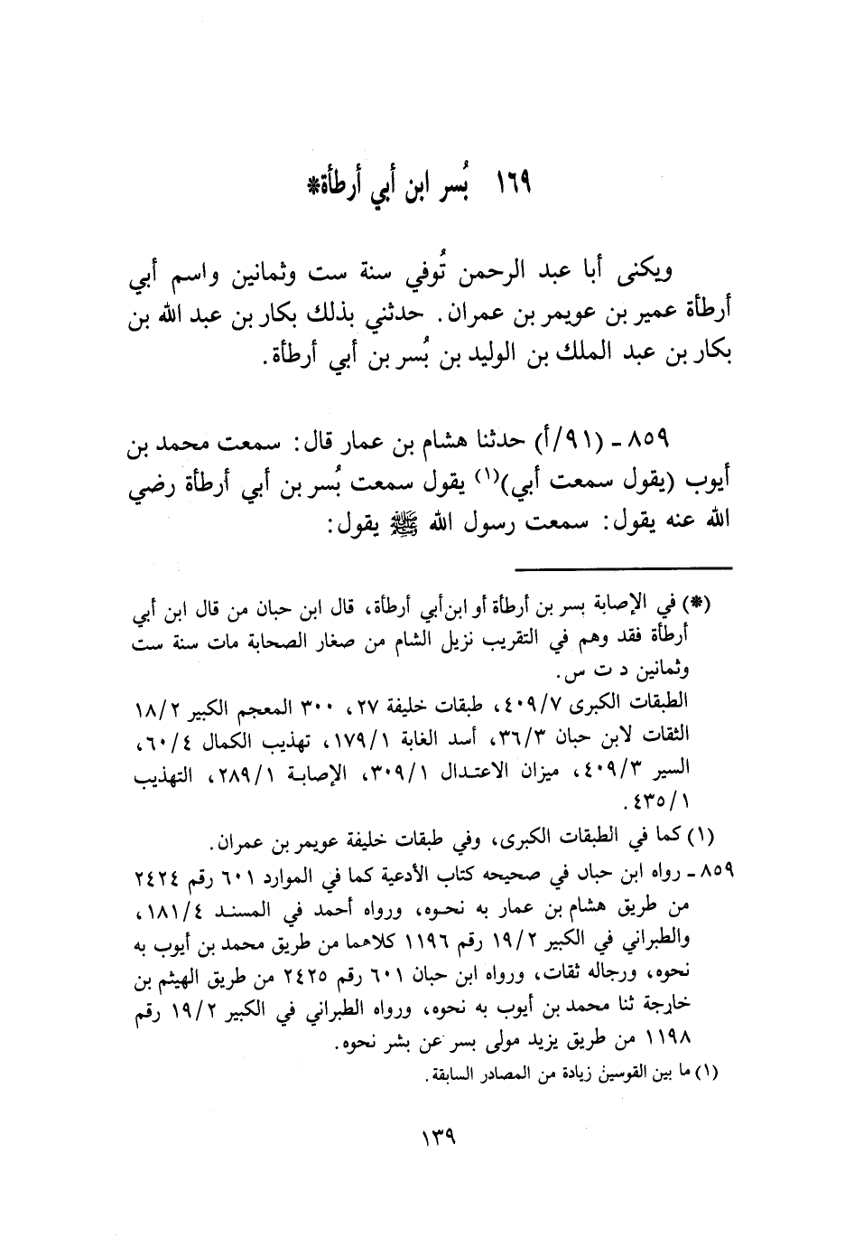 §بُسْرُ بْنُ أَبِي أَرْطَأةَ وَيُكْنَى أَبَا عَبْدِ الرَّحْمَنِ، تُوُفِّيَ سَنَةَ سِتٍّ وَثَمَانِينَ، وَاسْمُ أَبِي أَرْطَأةَ عُمَيْرُ بْنُ عُوَيْمِرِ بْنِ عِمْرَانَ، حَدَّثَنِي بِذَلِكَ بَكَّارُ بْنُ عَبْدِ اللَّهِ بْنِ بَكَّارِ بْنِ عَبْدِ الْمَلِكِ بْنِ الْوَلِيدِ بْنِ بُسْرِ بْنِ أَبِي أَرْطَأةَ