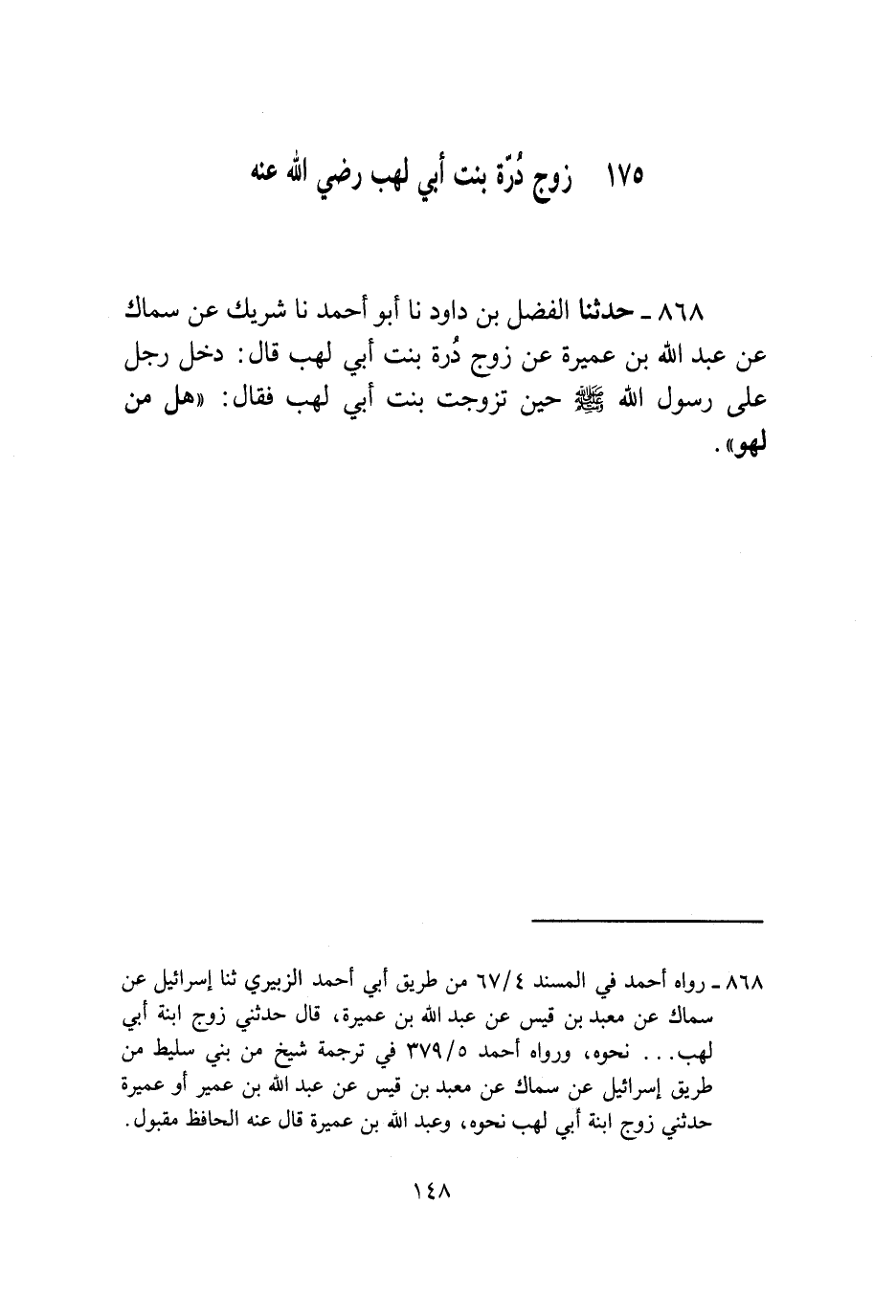 868 - حَدَّثَنَا الْفَضْلُ بْنُ دَاوُدَ، نا أَبُو أَحْمَدَ، نا شَرِيكٌ، عَنْ سِمَاكٍ، عَنْ عَبْدِ اللَّهِ بْنِ عَمِيرَةَ، عَنْ زَوْجِ دُرَّةَ بِنْتِ أَبِي لَهَبٍ قَالَ: دَخَلَ رَجُلٌ عَلَى رَسُولِ اللَّهِ صَلَّى اللهُ عَلَيْهِ وَسَلَّمَ حِينَ تَزَوَّجْتُ بِنْتَ أَبِي لَهَبٍ فَقَالَ: «§هَلْ مِنْ لَهْوٍ»