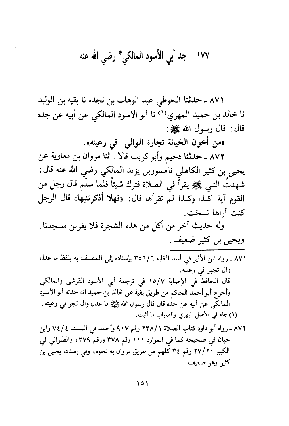 871 - حَدَّثَنَا الْحَوْطِيُّ عَبْدُ الْوَهَّابِ بْنُ نَجْدَةَ، نا بَقِيَّةُ بْنُ الْوَلِيدِ، نا خَالِدُ بْنُ حُمَيْدٍ الْمَهْرِيُّ، نا أَبُو الْأَسْوَدِ الْمَالِكِيُّ، عَنْ أَبِيهِ، عَنْ جَدِّهِ قَالَ: قَالَ رَسُولُ اللَّهِ صَلَّى اللهُ عَلَيْهِ وَسَلَّمَ: «§مِنْ أَخْوَنِ الْخِيَانَةِ تِجَارَةُ الْوَالِي فِي رَعِيَّتِهِ»