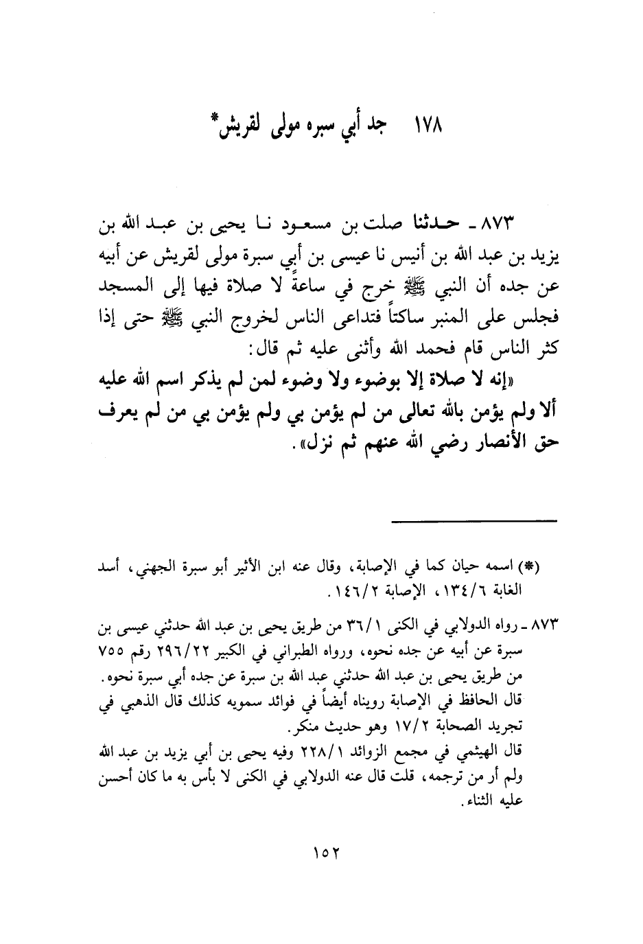 873 - حَدَّثَنَا صَلْتُ بْنُ مَسْعُودٍ، نا يَحْيَى بْنُ عَبْدِ اللَّهِ بْنِ يَزِيدَ بْنِ عَبْدِ اللَّهِ بْنِ أُنَيْسٍ، نا عِيسَى بْنُ أَبِي سَبْرَةَ مَوْلًى لِقُرَيْشٍ، عَنْ أَبِيهِ، عَنْ جَدِّهِ، أَنَّ النَّبِيَّ صَلَّى اللهُ عَلَيْهِ وَسَلَّمَ خَرَجَ فِي سَاعَةٍ لَا صَلَاةَ فِيهَا إِلَى الْمَسْجِدِ، فَجَلَسَ عَلَى الْمِنْبَرِ سَاكِتًا، فَتَدَاعَى النَّاسُ لِخُرُوجِ النَّبِيِّ صَلَّى اللهُ عَلَيْهِ وَسَلَّمَ، حَتَّى إِذَا كَثُرَ النَّاسُ قَامَ فَحَمِدَ اللَّهَ وَأَثْنَى عَلَيْهِ، ثُمَّ قَالَ: «إِنَّهُ §لَا صَلَاةَ إِلَّا بِوُضُوءٍ، وَلَا وُضُوءَ لِمَنْ لَمْ يُذْكَرِ اسْمَ اللَّهِ عَلَيْهِ، أَلَا وَلَمْ يُؤْمِنْ بِاللَّهِ تَعَالَى مَنْ لَمْ يُؤْمِنْ بِي، وَلَمْ يُؤْمِنْ بِي مَنْ لَمْ يَعْرِفْ حَقَّ الْأَنْصَارِ رَضِيَ اللَّهُ عَنْهُمْ» ، ثُمَّ نَزَلَ