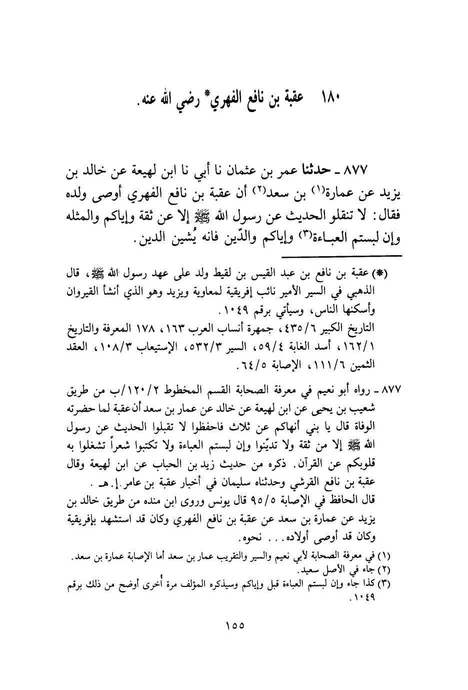 877 - حَدَّثَنَا عُمَرُ بْنُ عُثْمَانَ، نا أَبِي، نا ابْنُ لَهِيعَةَ، عَنْ خَالِدِ بْنِ يَزِيدَ، عَنْ عُمَارَةَ بْنِ سَعْدٍ، أَنَّ عُقْبَةَ بْنَ نَافِعٍ الْفِهْرِيَّ أَوْصَى وَلَدَهُ فَقَالَ: «§لَا تَنْقِلُوا الْحَدِيثَ عَنْ رَسُولِ اللَّهِ صَلَّى اللهُ عَلَيْهِ وَسَلَّمَ إِلَّا عَنْ ثِقَةٍ، وَإِيَّاكُمْ وَالْمُثْلَةَ، وَإِنْ لَبِسْتُمُ الْعَبَاءَةَ، وَإِيَّاكُمْ وَالدَّيْنَ، فَإِنَّهُ يَشِينُ الدِّينَ»
