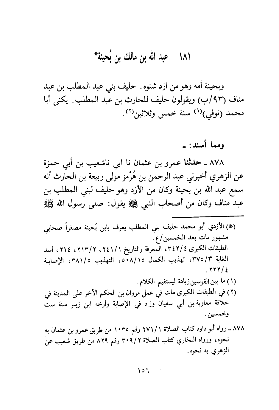 §عَبْدُ اللَّهِ بْنُ مَالِكِ بْنِ بُحَيْنَةَ وَبُحَيْنَةُ أُمُّهُ، وَهُوَ مِنْ أَزْدِ شَنُوءَةَ، حَلِيفُ بَنِي عَبْدِ الْمُطَّلِبِ بْنِ عَبْدِ مَنَافٍ، وَيَقُولُونَ: حَلِيفٌ لِلْحَارِثِ بْنِ عَبْدِ الْمُطَّلِبِ، يُكْنَى أَبَا مُحَمَّدٍ، تُوُفِّيَ سَنَةَ خَمْسٍ وَثَلَاثِينَ، وَمِمَّا أَسْنَدَ: