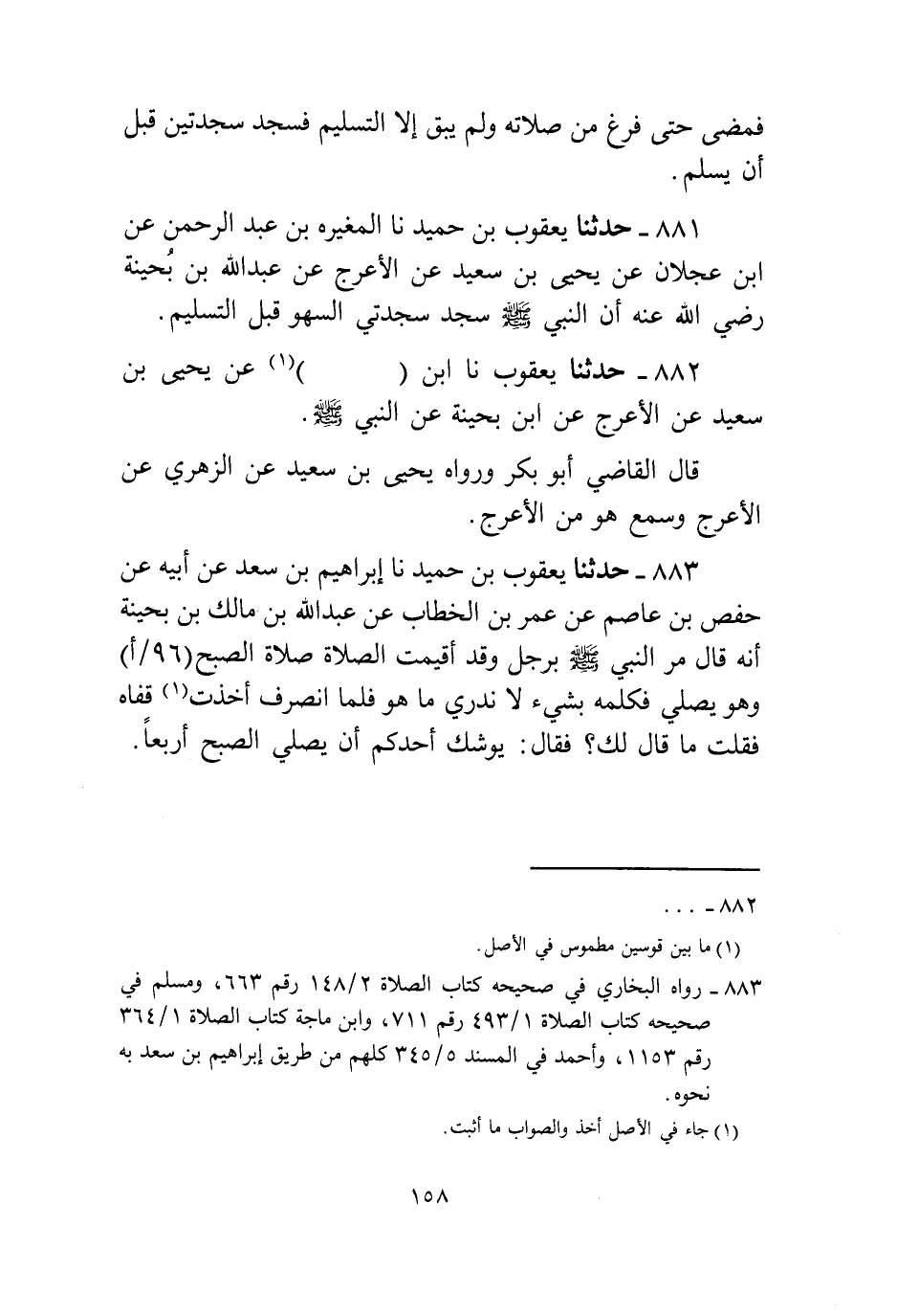 883 - حَدَّثَنَا يَعْقُوبُ بْنُ حُمَيْدٍ، نا إِبْرَاهِيمُ بْنُ سَعْدٍ، عَنْ أَبِيهِ، عَنْ حَفْصِ بْنِ عَاصِمِ بْنِ عُمَرَ بْنِ الْخَطَّابِ، عَنْ عَبْدِ اللَّهِ بْنِ مَالِكِ بْنِ بُحَيْنَةَ أَنَّهُ قَالَ: مَرَّ النَّبِيُّ صَلَّى اللهُ عَلَيْهِ وَسَلَّمَ بِرَجُلٍ وَقَدْ أُقِيمَتِ الصَّلَاةُ صَلَاةُ الصُّبْحِ وَهُوَ يُصَلِّي، فَكَلَّمَهُ بِشَيْءٍ لَا نَدْرِي مَا هُوَ، فَلَمَّا انْصَرَفَ أَخَذْتُ قَفَاهُ فَقُلْتُ: مَا قَالَ لَكَ؟ فَقَالَ: «§يُوشِكُ أَحَدُكُمْ أَنْ يُصَلِّيَ الصُّبْحَ أَرْبَعًا» -[159]-،