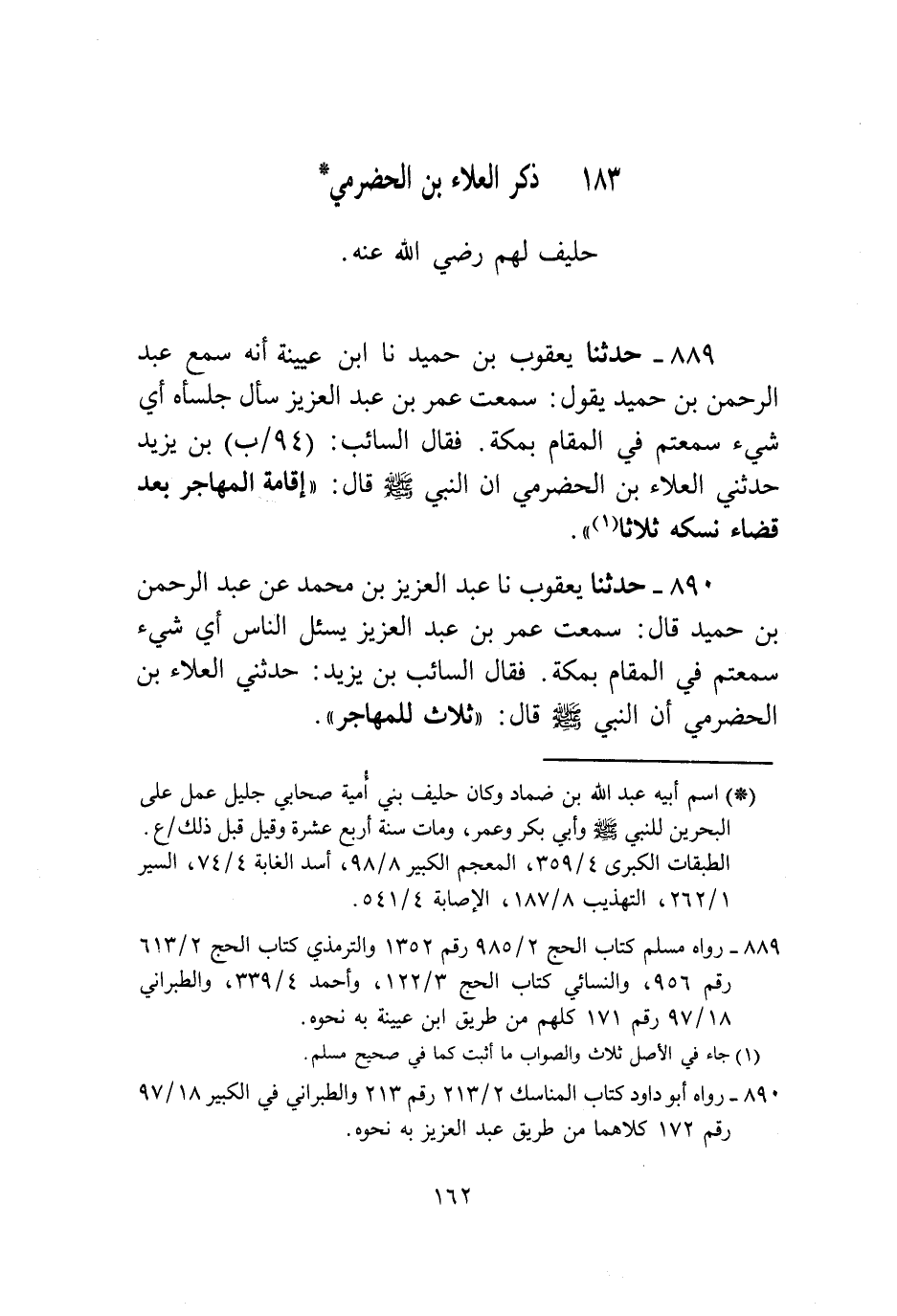 889 - حَدَّثَنَا يَعْقُوبُ بْنُ حُمَيْدٍ، نا ابْنُ عُيَيْنَةَ، أَنَّهُ سَمِعَ عَبْدَ الرَّحْمَنِ بْنَ حُمَيْدٍ يَقُولُ: سَمِعْتُ عُمَرَ بْنَ عَبْدِ الْعَزِيزِ سَأَلَ جُلَسَاءَهُ: أَيُّ شَيْءٍ سَمِعْتُمْ فِي الْمُقَامِ بِمَكَّةَ؟ فَقَالَ السَّائِبُ بْنُ يَزِيدَ: حَدَّثَنِي الْعَلَاءُ بْنُ الْحَضْرَمِيَّ، أَنَّ النَّبِيَّ صَلَّى اللهُ عَلَيْهِ وَسَلَّمَ قَالَ: «§إِقَامَةُ الْمُهَاجِرِ بَعْدَ قَضَاءِ نُسُكِهِ ثَلَاثًا»