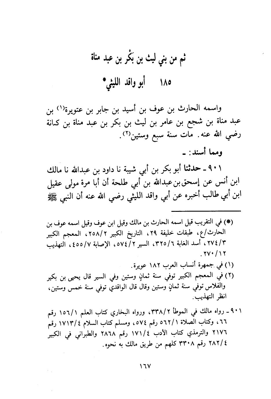 §أَبُو وَاقِدٍ اللَّيْثِيُّ وَاسْمُهُ الْحَارِثُ بْنُ عَوْفِ بْنِ أُسَيْدِ بْنِ جَابِرِ بْنِ عُتْوَيْرَةَ بْنِ عَبْدِ مَنَاةَ بْنِ شَجَعِ بْنِ عَامِرِ بْنِ لَيْثِ بْنِ بَكْرِ بْنِ عَبْدِ مَنَاةِ بْنِ كِنَانَةَ رَضِيَ اللَّهُ عَنْهُ، مَاتَ سَنَةَ سَبْعٍ وَسِتِّينَ، وَمِمَّا أَسْنَدَ