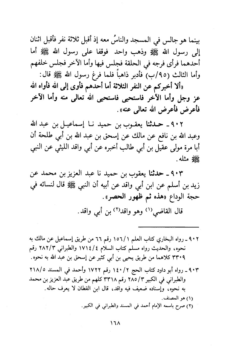 903 - حَدَّثَنَا يَعْقُوبُ بْنُ حُمَيْدٍ، نا عَبْدُ الْعَزِيزِ بْنُ مُحَمَّدٍ، عَنْ زَيْدِ بْنِ أَسْلَمَ، عَنِ ابْنِ أَبِي وَاقِدٍ، عَنْ أَبِيهِ، أَنَّ النَّبِيَّ صَلَّى اللهُ عَلَيْهِ وَسَلَّمَ قَالَ لِنِسَائِهِ فِي حَجَّةِ الْوَدَاعِ: «§هَذِهِ، ثُمَّ ظُهُورَ الْحُصْرِ» ، قَالَ الْقَاضِي: وَهُوَ وَاقِدُ بْنُ أَبِي وَاقِدٍ
