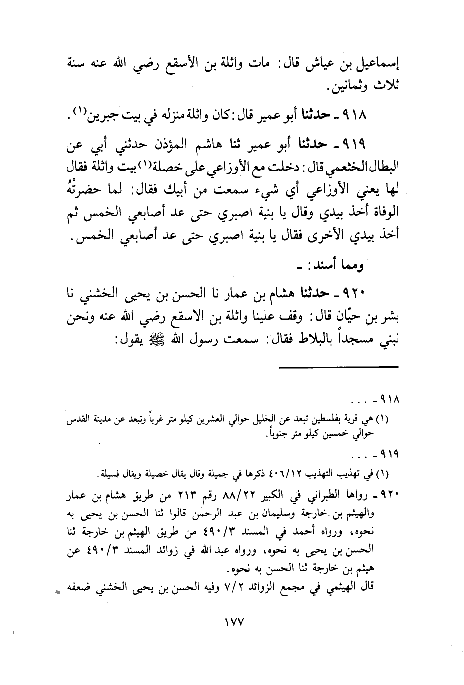 919 - حَدَّثَنَا أَبُو عُمَيْرٍ، ثنا هَاشِمٌ الْمُؤَذِّنُ، حَدَّثَنِي أَبِي، عَنِ الْبَطَّالِ الْخَثْعَمِيِّ قَالَ: دَخَلْتُ مَعَ الْأَوْزَاعِيِّ عَلَى خَصْلَةَ بِنْتِ وَاثِلَةَ، فَقَالَ لَهَا - يَعْنِي الْأَوْزَاعِيَّ - أَيُّ شَيْءٍ سَمِعْتِ مِنْ أَبِيكِ؟ فَقَالَتْ: لَمَّا حَضَرَتْهُ الْوَفَاةُ أَخَذَ بِيَدِي وَقَالَ: «§يَا بُنَيَّةُ اصْبِرِي، حَتَّى عَدَّ أَصَابِعِي الْخَمْسَ» ، ثُمَّ أَخَذَ بِيَدِي الْأُخْرَى فَقَالَ: «يَا بُنَيَّةُ اصْبِرِي حَتَّى عَدَّ أَصَابِعِي الْخَمْسَ» وَمِمَّا أَسْنَدَ: