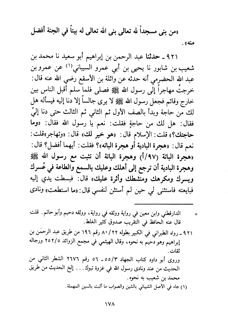 921 - حَدَّثَنَا عَبْدُ الرَّحْمَنِ بْنُ إِبْرَاهِيمَ أَبُو سَعِيدٍ، نا مُحَمَّدُ بْنُ شُعَيْبِ بْنِ شَابُورَ، نا يَحْيَى بْنُ أَبِي عَمْرٍو السَّيْبَانِيُّ، عَنْ عَمْرِو بْنِ عَبْدِ اللَّهِ الْحَضْرَمِيِّ أَنَّهُ حَدَّثَهُ عَنْ وَاثِلَةَ بْنِ الْأَسْقَعِ رَضِيَ اللَّهُ عَنْهُ قَالَ: خَرَجْتُ مُهَاجِرًا إِلَى رَسُولِ اللَّهِ صَلَّى اللهُ عَلَيْهِ وَسَلَّمَ، فَصَلَّى، فَلَمَّا سَلَّمَ أَقْبَلَ النَّاسُ بَيْنَ خَارِجٍ وَقَائِمٍ، فَجَعَلَ رَسُولُ اللَّهِ صَلَّى اللهُ عَلَيْهِ وَسَلَّمَ لَا يَرَى جَالِسًا إِلَّا دَنَا إِلَيْهِ فَيَسْأَلُهُ: «هَلْ لَكَ مِنْ حَاجَةٍ؟» ، وَبَدَأَ بِالصَّفِّ الْأَوَّلِ، ثُمَّ الثَّانِي، ثُمَّ الثَّالِثِ، حَتَّى دَنَا إِلَيَّ فَقَالَ: «هَلْ لَكَ مِنْ حَاجَةٍ؟» ، فَقُلْتُ: نَعَمْ يَا رَسُولَ اللَّهِ، فَقَالَ: «وَمَا حَاجَتُكَ؟» ، قُلْتُ: الْإِسْلَامُ، قَالَ: «هُوَ خَيْرٌ لَكَ» ، قَالَ: «وَتُهَاجِرُ؟» ، قُلْتُ: نَعَمْ، قَالَ: «هِجْرَةُ الْبَادِيَةِ أَوْ هِجْرَةُ الْبَاتَّةِ؟» ، فَقُلْتُ: أَيُّهُمَا أَفْضَلُ؟ قَالَ: «§هِجْرَةُ الْبَاتَّةِ، وَهِجْرَةُ الْبَاتَّةِ أَنْ تَثْبُتَ مَعَ رَسُولِ اللَّهِ صَلَّى اللهُ عَلَيْهِ وَسَلَّمَ، وَهِجْرَةُ الْبَادِيَةِ أَنْ تَرْجِعَ إِلَى أَهْلِكَ وَعَلَيْكَ بِالسَّمْعِ وَالطَّاعَةِ فِي عُسْرِكَ وَيُسْرِكَ، وَمَكْرَهِكَ وَمَنْشَطِكَ، وَأَثَرَةٍ عَلَيْكَ» ، قَالَ: فَبَسَطْتُ يَدِي إِلَيْهِ فَبَايَعْتُهُ، فَاسْتَثْنَى لِي حِينَ لَمِ اسْتَثْنِ لِنَفْسِي، قَالَ: «مَا اسْتَطَعْتَ» ، وَنَادَى -[179]- رَسُولُ اللَّهِ صَلَّى اللهُ عَلَيْهِ وَسَلَّمَ فِي غَزْوَةِ تَبُوكَ، فَخَرَجْتُ إِلَى أَهْلِي، فَوَافَيْتُ أَبِي جَالِسًا فِي الشَّمْسِ مُسْتَدْبِرَهَا، فَسَلَّمْتُ عَلَيْهِ بِتَسْلِيمِ الْإِسْلَامِ، فَقَالَ لِي: صَبَوْتَ؟ فَقُلْتُ: بَلْ أَسْلَمْتُ، فَقَالَ: لَعَلَّ اللَّهَ تَعَالَى يَجْعَلُ لَكَ وَلَنَا فِيهِ خَيْرًا، فَرَضِيَتُ بِذَلِكَ مِنْهُ، فَبَيْنَا أَنَا مَعَهُ إِذْ أَتَتْنِي أُخْتِي تُسَلِّمُ عَلَيَّ، فَقُلْتُ: يَا أُخْتُ زَوِّدِينِي زَادَ الْمَرْأَةِ أَخَاهَا غَازِيًا، قَالَ: فَأَتَتْ بِعَجِينٍ فِي دَلْوٍ، وَالدَّلْوُ فِي مِزْوَدٍ، فَأَقْبَلْتُ وَقَدْ خَرَجَ رَسُولُ اللَّهِ صَلَّى اللهُ عَلَيْهِ وَسَلَّمَ، قَالَ: فَجَعَلْتُ أُنَادِي: أَلَا مَنْ يَحْمِلُ رَجُلًا لَهُ سَهْمُهُ؟ فَنَادَانِي شَيْخٌ مِنَ الْأَنْصَارِ فَقَالَ: لَنَا سَهْمُهُ عَلَى أَنْ يَحْمِلَ عَقِبَهَ وَطَعَامَهُ مَعَنَا، قَالَ: قُلْتُ: نَعَمْ، قَالَ: فَسِرْ عَلَى بَرَكَةِ اللَّهِ تَعَالَى، قَالَ: فَخَرَجْتُ مَعَ خَيْرِ صَاحِبٍ، زَادَنِي حُمْلَانًا عَلَى مَا شَارَطْتُهُ، وَخَصَّنِي بِطَعَامٍ سِوَى مَا أَطْعَمُ مَعَهُ، حَتَّى إِذَا أَفَاءَ اللَّهُ تَعَالَى عَلَيْنَا فَأَصَابَتْنِي قَلَائِصُ، قَالَ: فَسُقْتُهُنَّ حَتَّى أَتَيْتُهُ وَهُوَ فِي خِبَائِهِ فَدَعَوْتُهُ فَخَرَجَ، فَقَعَدَ عَلَى حَقِيبَةٍ مِنْ حَقَائِبِ إِبِلِهِ، ثُمَّ قَالَ: سُقْهُنَّ مُقْبِلَاتٍ، فَسُقْتُهُنَّ مُقْبِلَاتٍ، ثُمَّ قَالَ: سُقْهُنَّ مُدْبِرَاتٍ، فَسُقْتُهُنَّ مُدْبِرَاتٍ، فَقَالَ: مَا أَرَى قَلَائِصَكَ إِلَّا كِرَامًا، قَالَ: قُلْتُ: إِنَّمَا هِيَ غَنِيمَتُكَ الَّتِي شَرَطْتُ لَكَ، قَالَ: خُذْ قَلَائِصَكَ يَا ابْنَ أَخِي، فَغَيْرَ سَهْمِكَ أَرَدْنَا