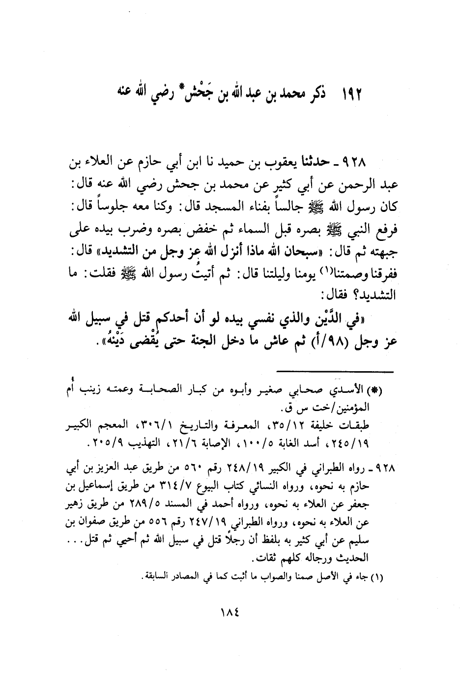 928 - حَدَّثَنَا يَعْقُوبُ بْنُ حُمَيْدٍ، نا ابْنُ أَبِي حَازِمٍ، عَنِ الْعَلَاءِ بْنِ عَبْدِ الرَّحْمَنِ، عَنْ أَبِي كَثِيرٍ، عَنْ مُحَمَّدِ بْنِ جَحْشٍ رَضِيَ اللَّهُ عَنْهُ قَالَ: كَانَ رَسُولُ اللَّهِ صَلَّى اللهُ عَلَيْهِ وَسَلَّمَ جَالِسًا بِفِنَاءِ الْمَسْجِدِ، قَالَ: وَكُنَّا مَعَهُ جُلُوسًا، قَالَ: فَرَفَعَ النَّبِيُّ صَلَّى اللهُ عَلَيْهِ وَسَلَّمَ بَصَرَهُ قِبَلَ السَّمَاءِ ثُمَّ خَفَضَ بَصَرَهُ، وَضَرَبَ بِيَدِهِ عَلَى جَبْهَتِهِ، ثُمَّ قَالَ: «سُبْحَانَ اللَّهِ مَاذَا أَنْزَلَ اللَّهُ عَزَّ وَجَلَّ مِنَ التَّشْدِيدِ» ، قَالَ: فَفَرَقْنَا وَصَمَتْنَا يَوْمَنَا وَلَيْلَتَنَا، قَالَ: ثُمَّ أَتَيْتُ رَسُولَ اللَّهِ صَلَّى اللهُ عَلَيْهِ وَسَلَّمَ فَقُلْتُ: مَا التَّشْدِيدُ؟ فَقَالَ: «فِي الدَّيْنِ، وَالَّذِي نَفْسِي بِيَدِهِ §لَوْ أَنَّ أَحَدَكُمْ قُتِلَ فِي سَبِيلِ اللَّهِ عَزَّ وَجَلَّ ثُمَّ عَاشَ مَا دَخَلَ الْجَنَّةَ حَتَّى يُقْضَى دَيْنُهُ»