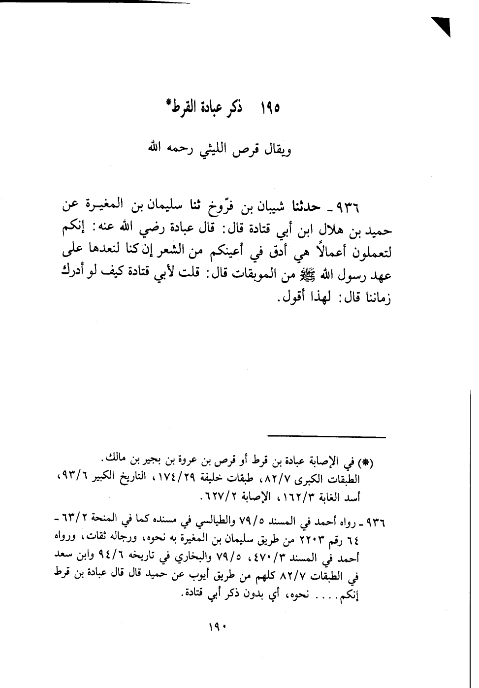 936 - حَدَّثَنَا شَيْبَانُ بْنُ فَرُّوخٍ، ثنا سُلَيْمَانُ بْنُ الْمُغِيرَةِ، عَنْ حُمَيْدِ بْنِ هِلَالٍ عَنْ أَبِي قَتَادَةَ قَالَ: قَالَ عُبَادَةُ رَضِيَ اللَّهُ عَنْهُ: «§إِنَّكُمْ لَتَعْمَلُونَ أَعْمَالًا هِيَ أَدَقُّ فِي أَعْيُنِكُمْ مِنَ الشَّعْرِ، إِنْ كُنَّا نَعُدُّهَا عَلَى عَهْدِ رَسُولِ اللَّهِ صَلَّى اللهُ عَلَيْهِ وَسَلَّمَ مِنَ الْمُوبِقَاتِ» ، قَالَ: قُلْتُ لِأَبِي قَتَادَةَ: كَيْفَ لَوْ أَدْرَكَ زَمَانَنَا؟ قَالَ: لِهَذَا أَقُولُ
