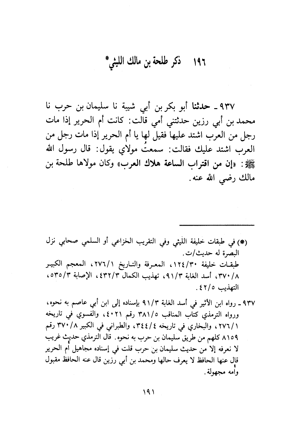 937 - حَدَّثَنَا أَبُو بَكْرِ بْنُ أَبِي شَيْبَةَ، نا سُلَيْمَانُ بْنُ حَرْبٍ، نا مُحَمَّدُ بْنُ أَبِي رَزِينٍ، حَدَّثَتْنِي أُمِّي، قَالَتْ: كَانَتْ أُمُّ الْحَرِيرِ إِذَا مَاتَ رَجُلٌ مِنَ الْعَرَبِ اشْتَدَّ عَلَيْهَا، فَقِيلَ لَهَا: يَا أُمَّ الْحَرِيرِ، إِذَا مَاتَ رَجُلٌ مِنَ الْعَرَبِ اشْتَدَّ عَلَيْكِ، فَقَالَتْ: سَمِعْتُ مَوْلَايَ يَقُولُ: قَالَ رَسُولُ اللَّهِ صَلَّى اللهُ عَلَيْهِ وَسَلَّمَ: «إِنَّ §مِنَ اقْتِرَابِ السَّاعَةِ هَلَاكُ الْعَرَبِ» ، وَكَانَ مَوْلَاهَا طَلْحَةُ بْنُ مَالِكٍ رَضِيَ اللَّهُ عَنْهُ