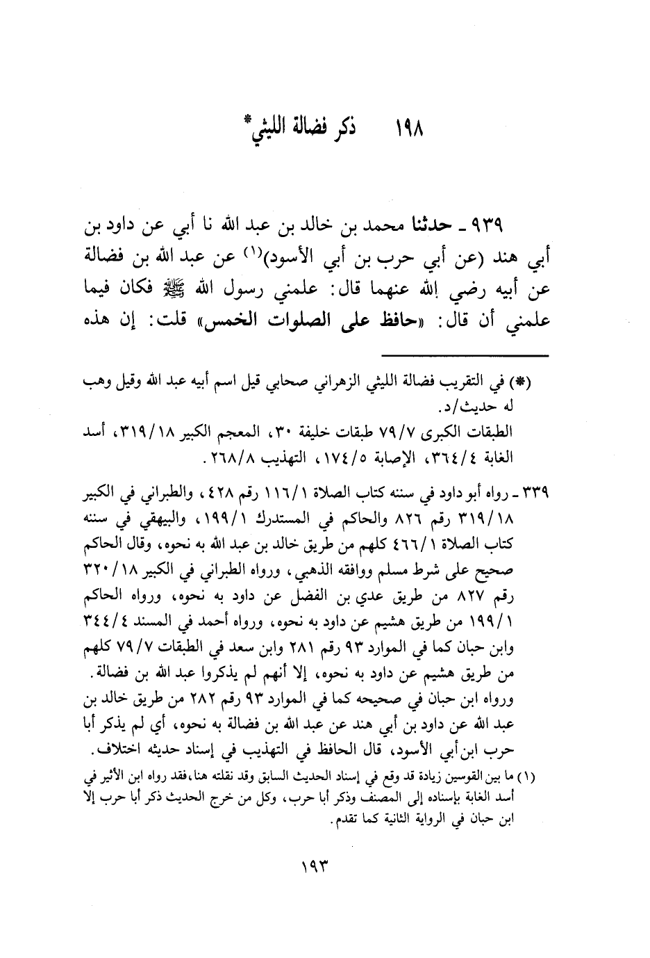 939 - حَدَّثَنَا مُحَمَّدُ بْنُ خَالِدِ بْنِ عَبْدِ اللَّهِ، نا أَبِي، عَنْ دَاوُدَ بْنِ أَبِي هِنْدَ، عَنْ أَبِي حَرْبِ بْنِ أَبِي الْأَسْوَدِ، عَنْ عَبْدِ اللَّهِ بْنِ فَضَالَةَ، عَنْ أَبِيهِ رَضِيَ اللَّهُ عَنْهُمَا قَالَ: عَلَّمَنِي رَسُولُ اللَّهِ صَلَّى اللهُ عَلَيْهِ وَسَلَّمَ، فَكَانَ فِيمَا عَلَّمَنِي أَنْ قَالَ: «§حَافِظْ عَلَى الصَّلَوَاتِ الْخَمْسِ» ، قُلْتُ: إِنَّ هَذِهِ -[194]- لَسَاعَاتٌ لِي فِيهَا أَشْغَالٌ، فَمُرْنِي بِأَمْرٍ جَامِعٍ إِذَا أَنَا فَعَلْتُهُ أَجْزَأَ عَنِّي، قَالَ: «حَافِظْ عَلَى الْعَصْرَيْنِ» ، قَالَ: وَمَا كَانَتْ مِنْ لُغَتِنَا، قَالَ: قُلْتُ: وَمَا الْعَصْرَانِ؟ قَالَ: «صَلَاةٌ قَبْلَ طُلُوعِ الشَّمْسِ، وَصَلَاةٌ قَبْلَ غُرُوبِهَا»