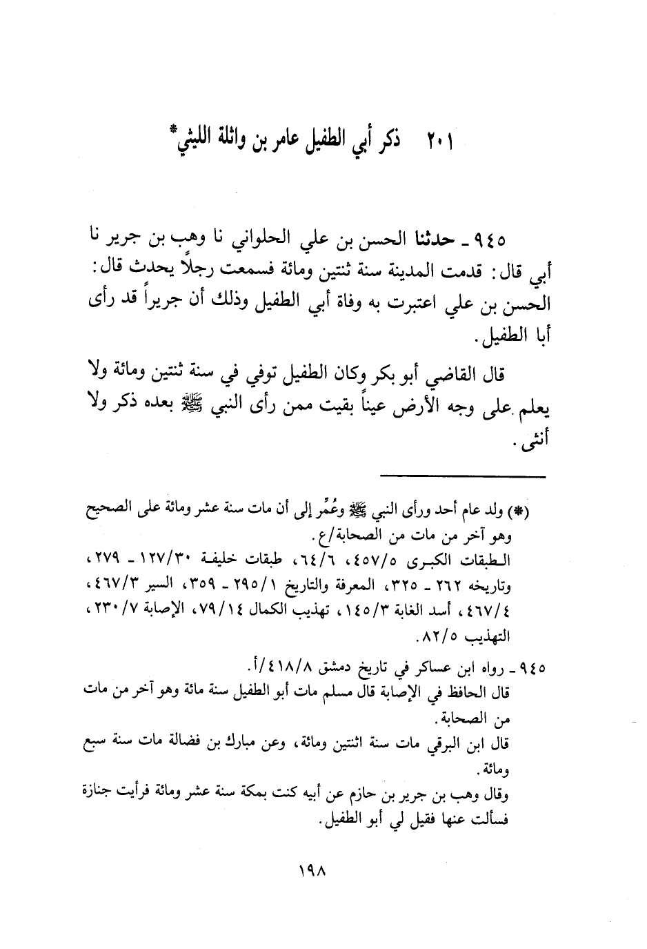945 - حَدَّثَنَا الْحَسَنُ بْنُ عَلِيٍّ الْحُلْوَانِيُّ، نا وَهْبُ بْنُ جَرِيرٍ، نا أَبِي قَالَ: " §قَدِمْتُ الْمَدِينَةَ سَنَةَ ثِنْتَيْنِ وَمِائَةٍ , فَسَمِعْتُ رَجُلًا، يُحَدِّثُ قَالَ: الْحَسَنُ بْنُ عَلِيٍّ اعْتَبَرْتُ بِهِ وَفَاةَ أَبِي الطُّفَيْلِ , وَذَلِكَ أَنَّ جَرِيرًا، قَدْ رَأَى أَبَا الطُّفَيْلِ. قَالَ الْقَاضِي أَبُو بَكْرٍ: «وَكَانَ الطُّفَيْلُ تُوُفِّيَ فِي سَنَةِ ثِنْتَيْنِ وَمِائَةٍ، لَا يُعْلَمُ عَلَى وَجْهِ الْأَرْضِ عَيْنٌ بَقِيَتْ مِمَّا رَأَى النَّبِيَّ صَلَّى اللهُ عَلَيْهِ وَسَلَّمَ بَعْدَهُ، ذَكَرٌ وَلَا أُنْثَى»