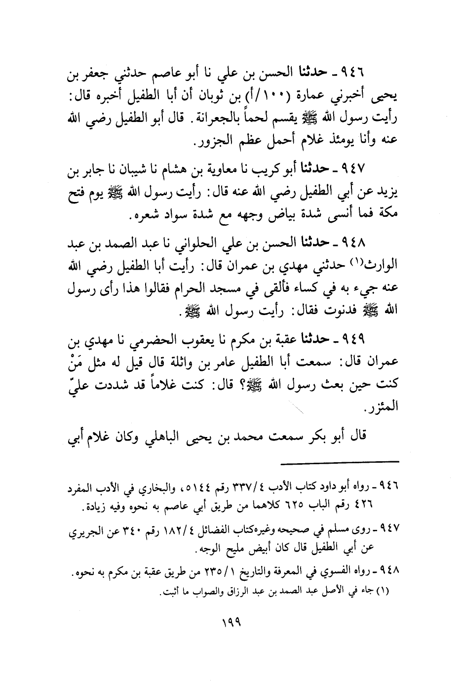 948 - حَدَّثَنَا الْحَسَنُ بْنُ عَلِيٍّ الْحُلْوَانِيُّ، نا عَبْدُ الصَّمَدِ بْنُ عَبْدِ الْوَارِثِ، حَدَّثَنِي مَهْدِيُّ بْنُ عِمْرَانَ، قَالَ: رَأَيْتُ أَبَا الطُّفَيْلِ رَضِيَ اللَّهُ عَنْهُ جِيءَ بِهِ فِي كِسَاءٍ فَأُلْقِيَ فِي مَسْجِدِ الْحَرَامِ، فَقَالُوا: هَذَا رَأَى رَسُولَ اللَّهِ صَلَّى اللهُ عَلَيْهِ وَسَلَّمَ، فَدَنَوْتُ فَقَالَ: «§رَأَيْتُ رَسُولَ اللَّهِ صَلَّى اللهُ عَلَيْهِ وَسَلَّمَ»