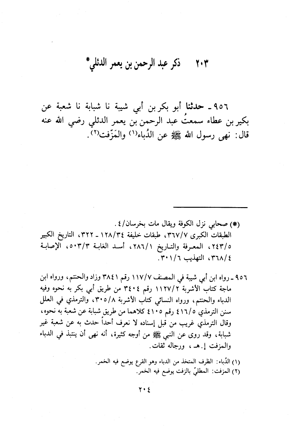 956 - حَدَّثَنَا أَبُو بَكْرِ بْنُ أَبِي شَيْبَةَ، نا شَبَابَةُ، نا شُعْبَةُ، عَنْ بُكَيْرِ بْنِ عَطَاءٍ، سَمِعْتُ عَبْدَ الرَّحْمَنِ بْنَ يَعْمَرَ الدِّئْلِيَّ رَضِيَ اللَّهُ عَنْهُ قَالَ: «§نَهَى رَسُولُ اللَّهِ صَلَّى اللهُ عَلَيْهِ وَسَلَّمَ عَنِ الدُّبَّاءِ وَالْمُزَفَّتِ»