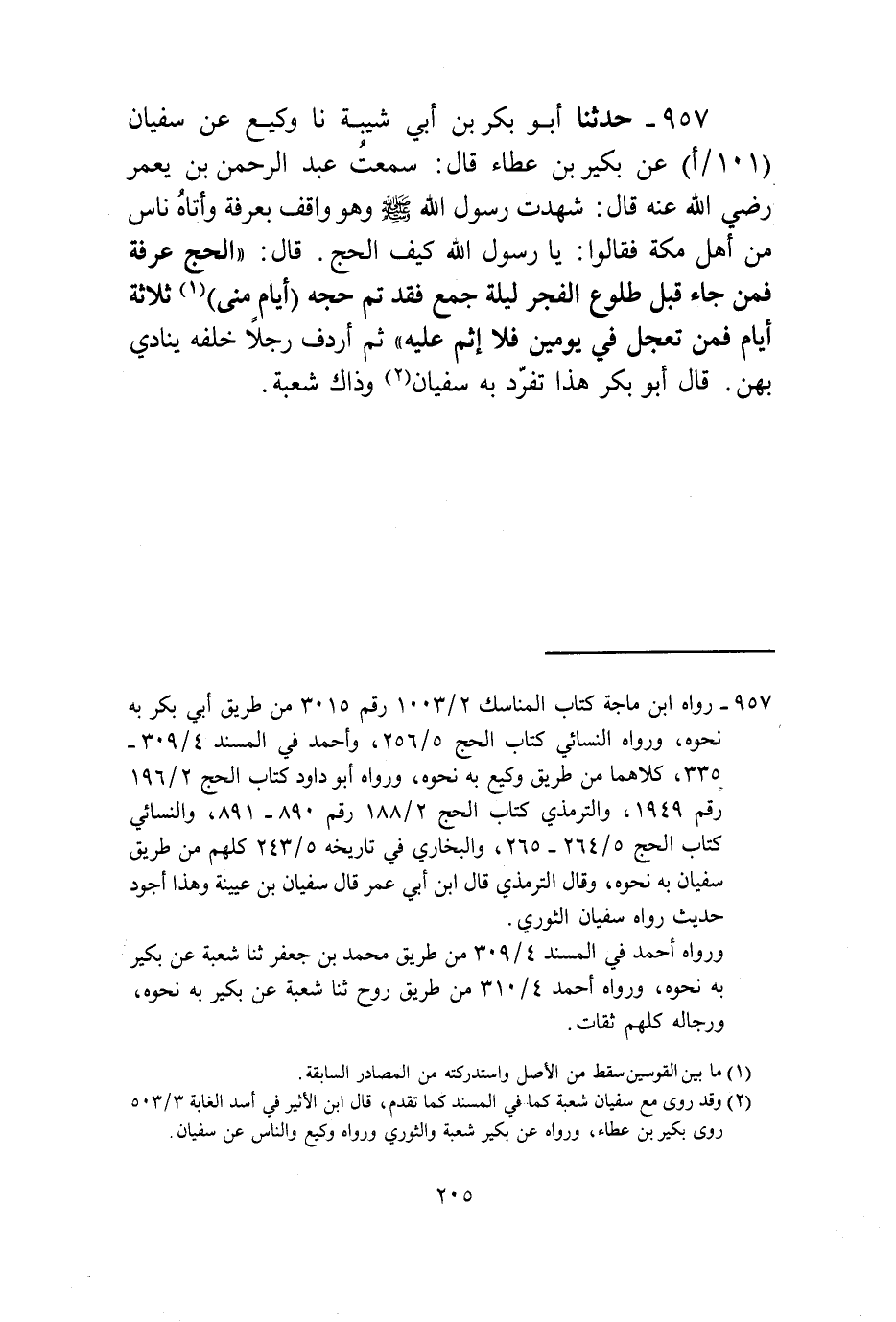 957 - حَدَّثَنَا أَبُو بَكْرِ بْنُ أَبِي شَيْبَةَ، نا وَكِيعٌ، عَنْ سُفْيَانَ، عَنْ بُكَيْرِ بْنِ عَطَاءٍ قَالَ: سَمِعْتُ عَبْدَ الرَّحْمَنِ بْنَ يَعْمَرَ رَضِيَ اللَّهُ عَنْهُ قَالَ: شَهِدْتُ رَسُولَ اللَّهِ صَلَّى اللهُ عَلَيْهِ وَسَلَّمَ وَهُوَ وَاقِفٌ بِعَرَفَةَ وَأَتَاهُ نَاسٌ مِنْ أَهْلِ مَكَّةَ، فَقَالُوا: يَا رَسُولَ اللَّهِ كَيْفَ الْحَجُّ؟ قَالَ: «§الْحَجُّ عَرَفَةُ، فَمَنْ جَاءَ قَبْلَ طُلُوعِ الْفَجْرِ لَيْلَةَ جَمْعٍ فَقَدْ تَمَّ حَجَّهُ، أَيَّامُ مِنًى ثَلَاثَةُ أَيَّامٍ، فَمَنْ تَعَجَّلَ فِي يَوْمَيْنِ فَلَا إِثْمَ عَلَيْهِ» ، ثُمَّ أَرْدَفَ رَجُلًا خَلْفَهُ يُنَادِي بِهِنَّ، قَالَ أَبُو بَكْرٍ: «هَذَا تَفَرَّدَ بِهِ سُفْيَانُ، وَذَاكَ شُعْبَةُ»
