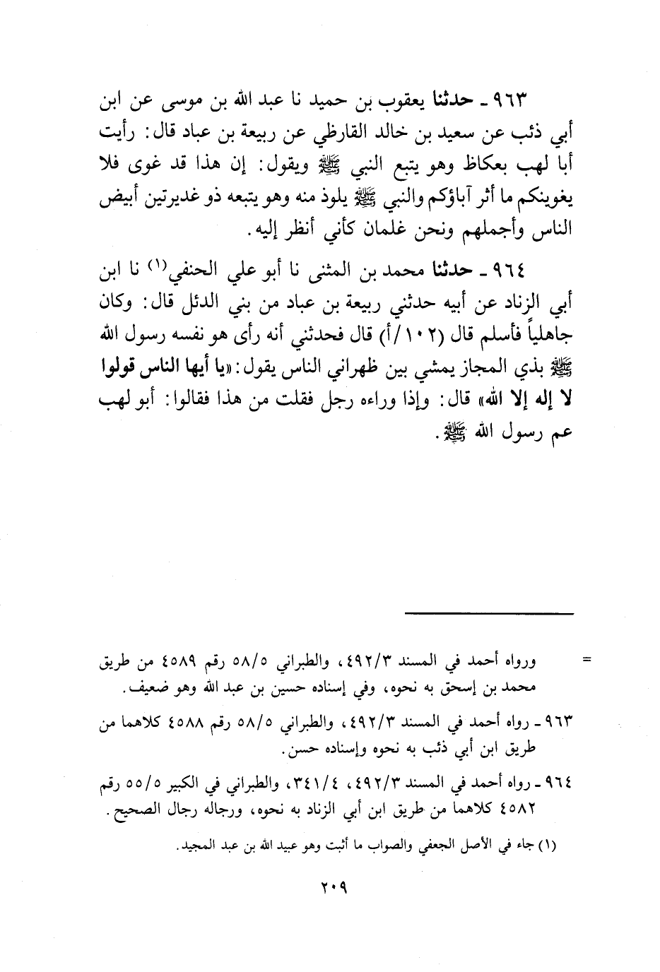 964 - حَدَّثَنَا مُحَمَّدُ بْنُ الْمُثَنَّى، نا أَبُو عَلِيٍّ الْحَنَفِيُّ، نا ابْنُ أَبِي الزِّنَادِ، عَنْ أَبِيهِ، حَدَّثَنِي رَبِيعَةُ بْنُ عِبَادٍ مِنْ بَنِي الدُّئِلِ، قَالَ: وَكَانَ جَاهِلِيًّا فَأَسْلَمَ، قَالَ: قَالَ: فَحَدَّثَنِي أَنَّهُ رَأَى هُوَ نَفْسُهُ رَسُولَ اللَّهِ صَلَّى اللهُ عَلَيْهِ وَسَلَّمَ بِذِي الْمَجَازِ يَمْشِي بَيْنَ ظَهْرَانَيِ النَّاسِ يَقُولُ: " يَا أَيُّهَا النَّاسُ: §قُولُوا: لَا إِلَهَ إِلَّا اللَّهُ "، قَالَ: وَإِذَا وَرَاءَهُ رَجُلٌ، فَقُلْتُ: مَنْ هَذَا؟ فَقَالُوا: أَبُو لَهَبٍ عَمُّ رَسُولِ اللَّهِ صَلَّى اللهُ عَلَيْهِ وَسَلَّمَ
