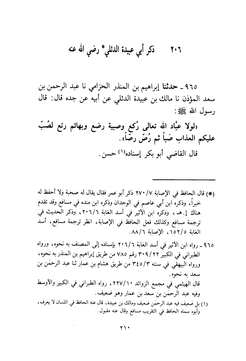 965 - حَدَّثَنَا إِبْرَاهِيمُ بْنُ الْمُنْذِرِ الْحِزَامِيُّ، نا عَبْدُ الرَّحْمَنِ بْنُ سَعْدٍ الْمُؤَذِّنُ، نا مَالِكُ بْنُ عُبَيْدَةَ الدِّئْلِيُّ، عَنْ أَبِيهِ، عَنْ جَدِّهِ قَالَ: قَالَ رَسُولُ اللَّهِ صَلَّى اللهُ عَلَيْهِ وَسَلَّمَ: «§لَوْلَا عِبَادٌ لِلَّهِ تَعَالَى رُكَّعٌ، وَصِبْيَةٌ رُضَّعٌ، وَبَهَائِمُ رُتَّعٌ، لَصُبَّ عَلَيْكُمُ الْعَذَابُ صَبًّا، ثُمَّ رُصَّ رَصًّا» ، قَالَ الْقَاضِي أَبُو بَكْرٍ: إِسْنَادُهُ حَسَنٌ