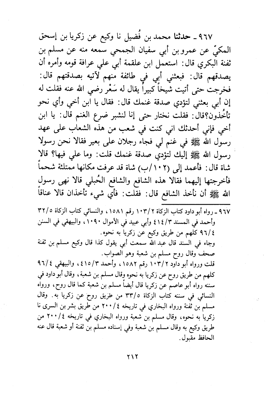 967 - حَدَّثَنَا مُحَمَّدُ بْنُ فُضَيْلٍ، نا وَكِيعٌ، عَنْ زَكَرِيَّا بْنِ إِسْحَاقَ الْمَكِّيِّ، عَنْ عَمْرِو بْنِ أَبِي سُفْيَانَ الْجُمَحِيِّ سَمِعَهُ مِنْهُ، عَنْ مُسْلِمِ بْنِ ثَفِنَةَ الْبَكْرِيِّ قَالَ: اسْتَعْمَلَ ابْنُ عَلْقَمَةَ أَبِي عَلَى عِرَافَةِ قَوْمِهِ، وَأَمَرَهُ أَنْ يُصْدِقَهُمْ، قَالَ: فَبَعَثَنِي أَبِي فِي طَائِفَةٍ مِنْهُمْ لِآتِيَهُ بِصَدَقَتِهِمْ، قَالَ: فَخَرَجْتُ حَتَّى أَتَيْتُ شَيْخًا كَبِيرًا يُقَالُ لَهُ: سَعْرٌ رَضِيَ اللَّهُ عَنْهُ، فَقُلْتُ لَهُ: إِنَّ أَبِي بَعَثَنِي لِتُؤَدِّيَ صَدَقَةَ غَنَمِكَ، قَالَ: فَقَالَ: يَا ابْنَ أَخِي، وَأَيُّ نَحْوٍ تَأْخُذُونَ؟ قَالَ: فَقُلْتُ: نَخْتَارُ حَتَّى إِنَّا لَنَشْبُرُ ضَرْعَ الْغَنَمِ، قَالَ: يَا ابْنَ أَخِي فَإِنِّي أُحَدِّثْكَ أَنِّي كُنْتُ فِي شِعْبٍ مِنْ هَذِهِ الشِّعَابِ عَلَى عَهْدِ رَسُولِ اللَّهِ صَلَّى اللهُ عَلَيْهِ وَسَلَّمَ فِي غَنَمٍ لِي، فَجَاءَ رَجُلَانِ عَلَى بَعِيرٍ فَقَالَا: «نَحْنُ رَسُولَا رَسُولِ اللَّهِ صَلَّى اللهُ عَلَيْهِ وَسَلَّمَ إِلَيْكَ لِتُؤَدِّيَ صَدَقَةَ غَنَمِكَ» ، قُلْتُ: وَمَا عَلَيَّ فِيهَا؟ قَالَا: «شَاةٌ» ، قَالَ: فَأَعْمِدُ إِلَى شَاةٍ قَدْ عَرَفْتُ مَكَانَهَا مُمْتَلِئَةٍ شَحْمًا، فَأَخْرَجْتُهَا إِلَيْهِمَا، فَقَالَا: «هَذِهِ الشَّافِعُ، وَالشَّافِعُ الْحُبْلى» ، قَالَا: «§نَهَى رَسُولُ اللَّهِ صَلَّى اللهُ عَلَيْهِ وَسَلَّمَ أَنْ نَأْخُذَ الشَّافِعَ» ، قَالَ: فَقُلْتُ: فَأَيُّ شَيْءٍ تَأْخُذَانِ؟ قَالَا: عَنَاقًا، أَوْ جَذَعَةً، أَوْ ثَنِيَّةً "، قَالَ: فَاعْمِدْ إِلَى عَنَاقٍ مُعْتَاطٍ، وَالْمُعْتَاطُ الَّتِي لَمْ تَلِدْ وَقَدْ حَانَ وِلَادُهَا، فَأَخْرَجْتُهَا إِلَيْهِمَا فَقَالَا: «نَاوِلْنَاهَا» ، فَدَفَعْتُهَا إِلَيْهِمَا وَهُمَا عَلَى بَعِيرِهِمَا فَحَمَلَاهَا عَلَى بَعِيرِهِمَا، ثُمَّ انْطَلَقَا