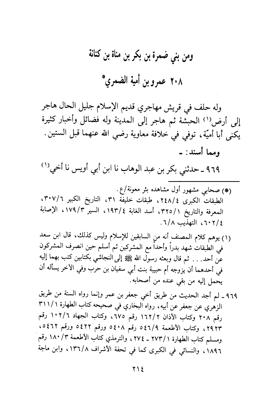 §عَمْرُو بْنُ أُمَيَّةَ الضَّمْرِيُّ وَلَهُ حِلْفٌ فِي قُرَيْشٍ، مُهَاجِرِيٌّ قَدِيمُ الْإِسْلَامِ، جَلِيلُ الْحَالِ، هَاجَرَ إِلَى أَرْضِ الْحَبَشَةِ، ثُمَّ هَاجَرَ إِلَى الْمَدِينَةِ، وَلَهُ فَضَائِلُ وَأَخْبَارٌ كَثِيرَةٌ، يُكْنَى أَبَا أُمَيَّةَ، تُوُفِّيَ فِي خِلَافَةِ مُعَاوِيَةَ رَضِيَ اللَّهُ عَنْهُمَا قَبْلَ السِّتِّينَ، وَمِمَّا أَسْنَدَ