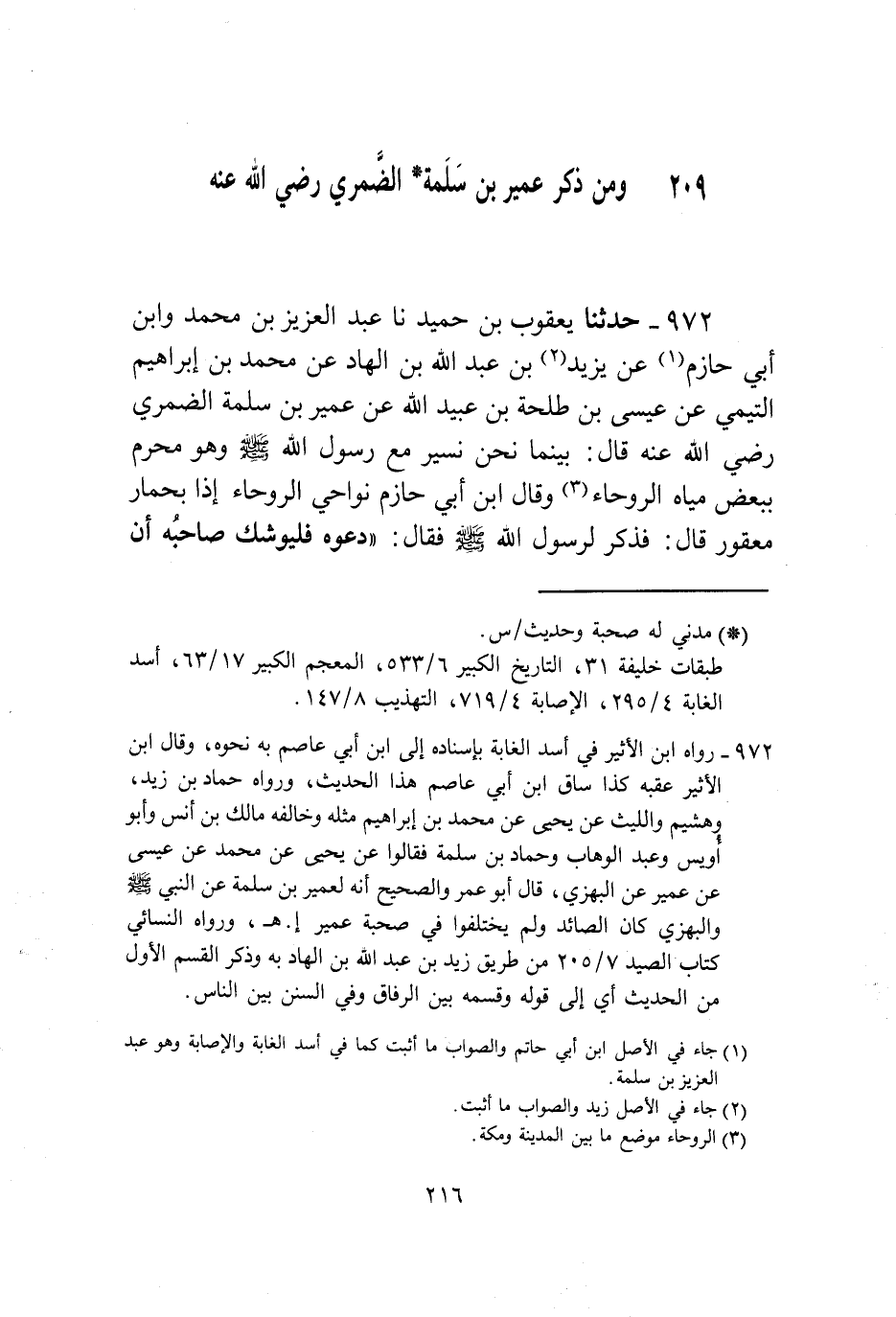 972 - حَدَّثَنَا يَعْقُوبُ بْنُ حُمَيْدٍ، نا عَبْدُ الْعَزِيزِ بْنُ مُحَمَّدٍ، وَابْنُ أَبِي حَازِمٍ، عَنْ يَزِيدَ بْنِ عَبْدِ اللَّهِ بْنِ الْهَادِ، عَنْ مُحَمَّدِ بْنِ إِبْرَاهِيمَ التَّيْمِيِّ، عَنْ عِيسَى بْنِ طَلْحَةَ بْنِ عُبَيْدِ اللَّهِ، عَنْ عُمَيْرِ بْنِ سَلَمَةَ الضَّمْرِيِّ رَضِيَ اللَّهُ عَنْهُ قَالَ: بَيْنَمَا نَحْنُ نَسِيرُ مَعَ رَسُولِ اللَّهِ صَلَّى اللهُ عَلَيْهِ وَسَلَّمَ وَهُوَ مُحْرِمٌ بِبَعْضِ مِيَاهِ الرَّوْحَاءِ، وَقَالَ ابْنُ أَبِي حَازِمٍ: نَوَاحِي الرَّوْحَاءِ، إِذَا بِحِمَارٍ مَعْقُورٍ، قَالَ: فَذُكِرَ لِرَسُولِ اللَّهِ صَلَّى اللهُ عَلَيْهِ وَسَلَّمَ فَقَالَ: «§دَعُوهُ فَلْيُوشِكْ صَاحِبُهُ أَنْ -[217]- يَأْتِيَهُ» ، قَالَ: فَأَتَاهُ صَاحِبُهُ الَّذِي عَقَرَهُ وَهُوَ رَجُلٌ مِنْ بَهْزٍ، فَقَالَ: يَا رَسُولَ اللَّهِ، شَأْنُكُمْ بِهَذَا الْحِمَارِ، وَأَمَرَ النَّبِيُّ صَلَّى اللهُ عَلَيْهِ وَسَلَّمَ أَبَا بَكْرٍ فَقَسَمَهُ بَيْنَ الرِّفَاقِ، قَالَ: ثُمَّ مَضَى، فَلَمَّا كَانَ بِالْإِثَابَةِ مَرَّ بِظَبْيٍ حَاقِفٍ فِي ظِلِّ شَجَرَةٍ فِيهِ سَهْمٌ، فَأَمَرَ النَّبِيُّ صَلَّى اللهُ عَلَيْهِ وَسَلَّمَ أَنْ لَا يُهَيِّجَهُ إِنْسَانٌ، فَنَفِدَ النَّاسُ وَتَرَكُوهُ، قَالَ أَبُو بَكْرٍ: وَرَوَاهُ يَحْيَى بْنُ سَعِيدٍ الْأَنْصَارِيُّ، عَنْ مُحَمَّدِ بْنِ إِبْرَاهِيمَ، عَنْ عِيسَى بْنِ طَلْحَةَ، عَنْ عُمَيْرِ بْنِ سَلَمَةَ
