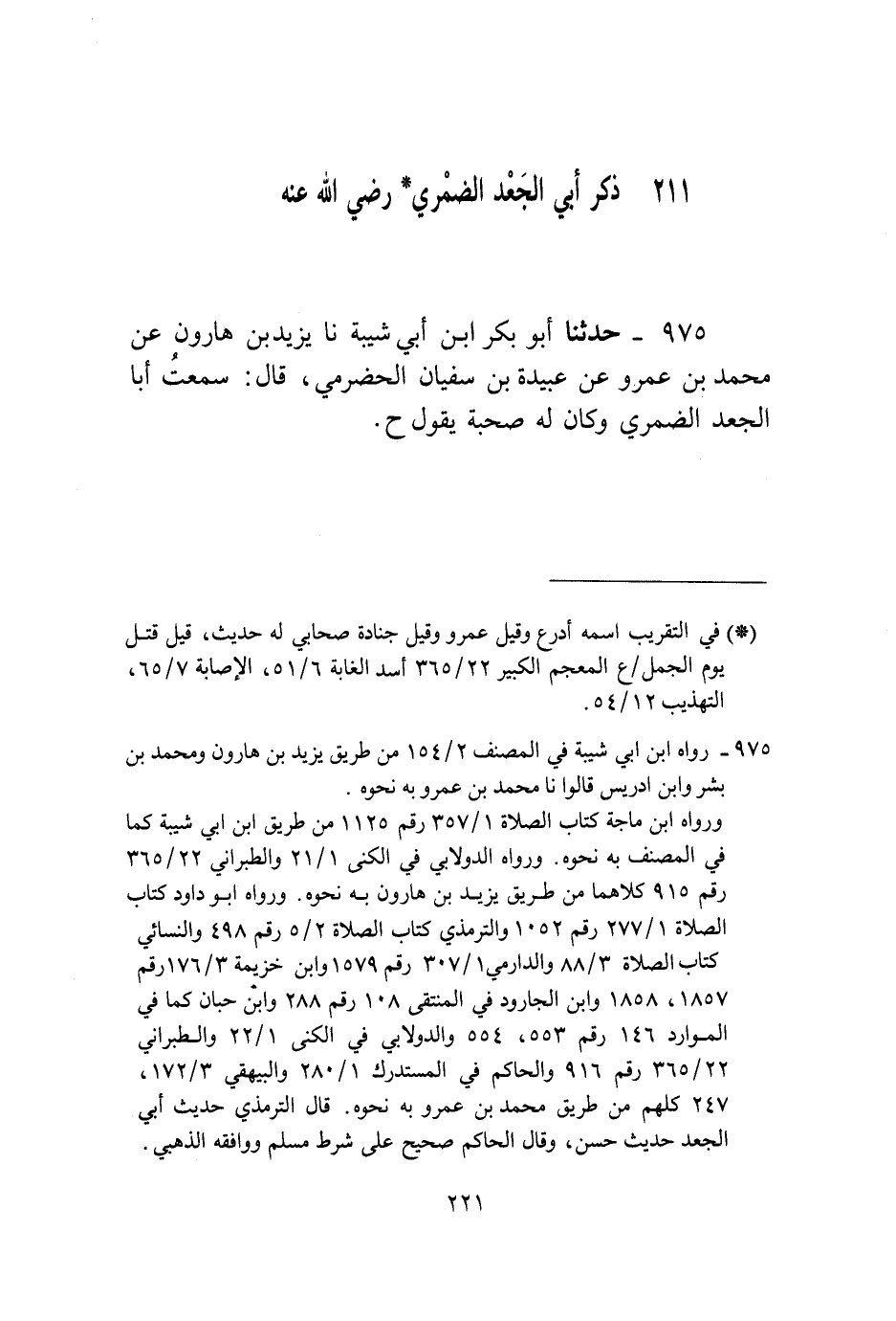 975 - حَدَّثَنَا أَبُو بَكْرِ بْنُ أَبِي شَيْبَةَ، نا يَزِيدُ بْنُ هَارُونَ، عَنْ مُحَمَّدِ بْنِ عَمْرٍو، عَنْ عُبَيْدَةَ بْنِ سُفْيَانَ الْحَضْرَمِيِّ قَالَ: سَمِعْتُ أَبَا الْجَعْدِ الضَّمْرِيَّ، وَكَانَ لَهُ صُحْبَةٌ يَقُولُ، ح