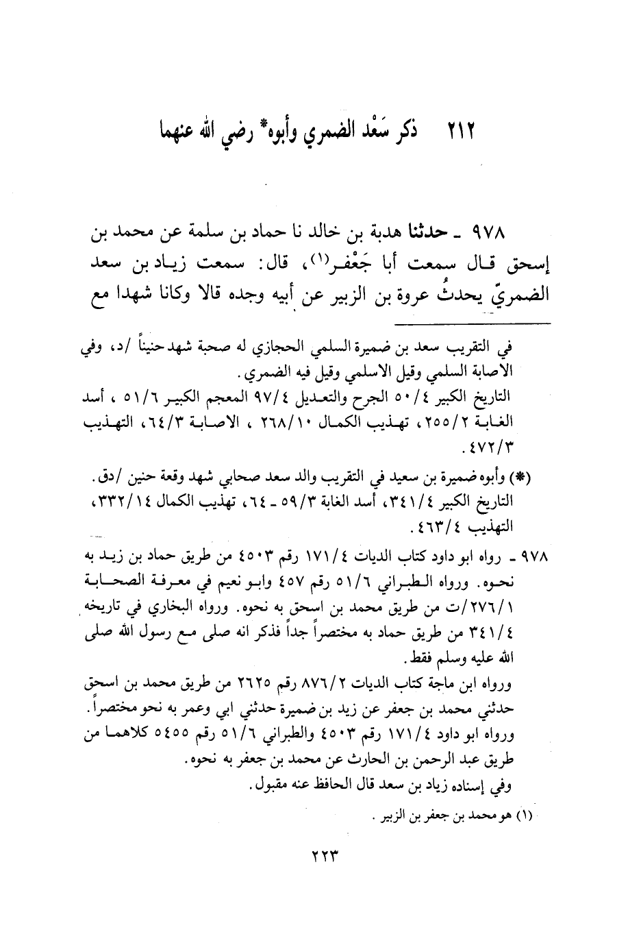 978 - حَدَّثَنَا هُدْبَةُ بْنُ خَالِدٍ، نا حَمَّادُ بْنُ سَلَمَةَ، عَنْ مُحَمَّدِ بْنِ إِسْحَاقَ قَالَ: سَمِعْتُ أَبَا جَعْفَرٍ قَالَ: سَمِعْتُ زِيَادَ بْنَ سَعْدٍ الضَّمْرِيَّ، يُحَدِّثُ عُرْوَةَ بْنَ الزُّبَيْرِ، عَنْ أَبِيهِ، وَجَدِّهِ قَالَا: وَكَانَا شَهِدَا مَعَ -[224]- رَسُولِ اللَّهِ صَلَّى اللهُ عَلَيْهِ وَسَلَّمَ حُنَيْنًا، صَلَّى رَسُولُ اللَّهِ صَلَّى اللهُ عَلَيْهِ وَسَلَّمَ الظُّهْرَ، ثُمَّ قَامَ إِلَى ظِلِّ شَجَرَةٍ فَقَعَدَ فِيهِ، فَقَامَ إِلَيْهِ عُيَيْنَةُ بْنُ بَدْرٍ يَطْلُبُ دَمَ عَامِرِ بْنِ الْأَضْبَطِ، وَهُوَ سَيِّدُ قَيْسٍ، فَجَاءَ الْأَقْرَعُ بْنُ حَابِسٍ يَرُدُّ عَنْ مُحَلِّمِ بْنِ جَثَّامَةَ، وَهُوَ سَيِّدُ خِنْدِفَ، فَقَالَ رَسُولُ اللَّهِ صَلَّى اللهُ عَلَيْهِ وَسَلَّمَ لِقَوْمِ عَامِرِ بْنِ الْأَضْبَطِ: «§هَلْ لَكُمْ أَنْ تَأْخُذُوا الْآنَ خَمْسِينَ بَعِيرًا؟ وَإِذَا رَجَعْنَا إِلَى الْمَدِينَةِ خَمْسِينَ بَعِيرًا؟» ، فَقَالَ عُيَيْنَةُ بْنُ بَدْرٍ: لَا أَدَعُهُ حَتَّى أُذِيقَ نِسَاءَهُ مِنَ الْحُزْنِ مَا ذَاقَ نِسَائِي، فَقَامَ رَجُلٌ مِنْ بَنِي لَيْثٍ يُقَالُ لَهُ: مَطَرٌ نَصَفٌ ـ يَعْنِي كَهْلٌ مِنَ الرِّجَالِ ـ فَقَالَ: يَا رَسُولَ اللَّهِ، مَا أَجِدُ لِهَذَا الْقَتْلِ مِثَالًا فِي غُرَّةِ الْإِسْلَامِ إِلَّا كَغَنَمٍ وَرَدَتْ فَرُمِيَتْ أُولَاهَا فَنَفَرَتْ أُخْرَاهَا، اسْنُنِ الْيَوْمَ وَغَيِّرْ غَدًا، فَقَالَ رَسُولُ اللَّهِ صَلَّى اللهُ عَلَيْهِ وَسَلَّمَ لِقَوْمِهِ: «هَلْ لَكُمْ أَنْ تَأْخُذُوا خَمْسِينَ بَعِيرًا، وَإِذَا رَجَعْنَا إِلَى الْمَدِينَةِ خَمْسِينَ بَعِيرًا؟» ، فَلَمْ يَزَلْ بِهِمْ حَتَّى رَضُوا بِالدِّيَةِ، فَقَالَ قَوْمُ مُحَلِّمِ بْنِ جَثَّامَةَ: تَعَالَ حَتَّى يَسْتَغْفِرَ لَكَ رَسُولُ اللَّهِ صَلَّى اللهُ عَلَيْهِ وَسَلَّمَ، فَجَاءَ رَجُلٌ ضَرَبَ اللَّحْمُ فِي حُلَّةٍ، قَدْ تَهَيَّأَ فِيهَا لِلْقَتْلِ، فَقَعَدَ بَيْنَ يَدَيْ رَسُولِ اللَّهِ صَلَّى اللهُ عَلَيْهِ وَسَلَّمَ، فَقَالَ رَسُولُ اللَّهِ صَلَّى اللهُ عَلَيْهِ وَسَلَّمَ: «اللَّهُمَّ لَا تَغْفِرْ لِمُحَلِّمٍ، اللَّهُمَّ لَا تَغْفِرْ لِمُحَلِّمٍ اللَّهُمَّ لَا تَغْفِرْ لِمُحَلِّمٍ اللَّهُمَّ لَا تَغْفِرْ لِمُحَلِّمٍ» ، ثَلَاثًا، فَقَامَ وَإِنَّهُ لَيَتَلَقَّى دُمُوعَهُ بِطَرَفِ ثَوْبِهِ، قَالَ ابْنُ إِسْحَاقَ: فَزَعَمَ لِي قَوْمُهُ أَنَّ رَسُولَ اللَّهِ صَلَّى اللهُ عَلَيْهِ وَسَلَّمَ اسْتَغْفَرَ لَهُ بَعْدَ ذَلِكَ