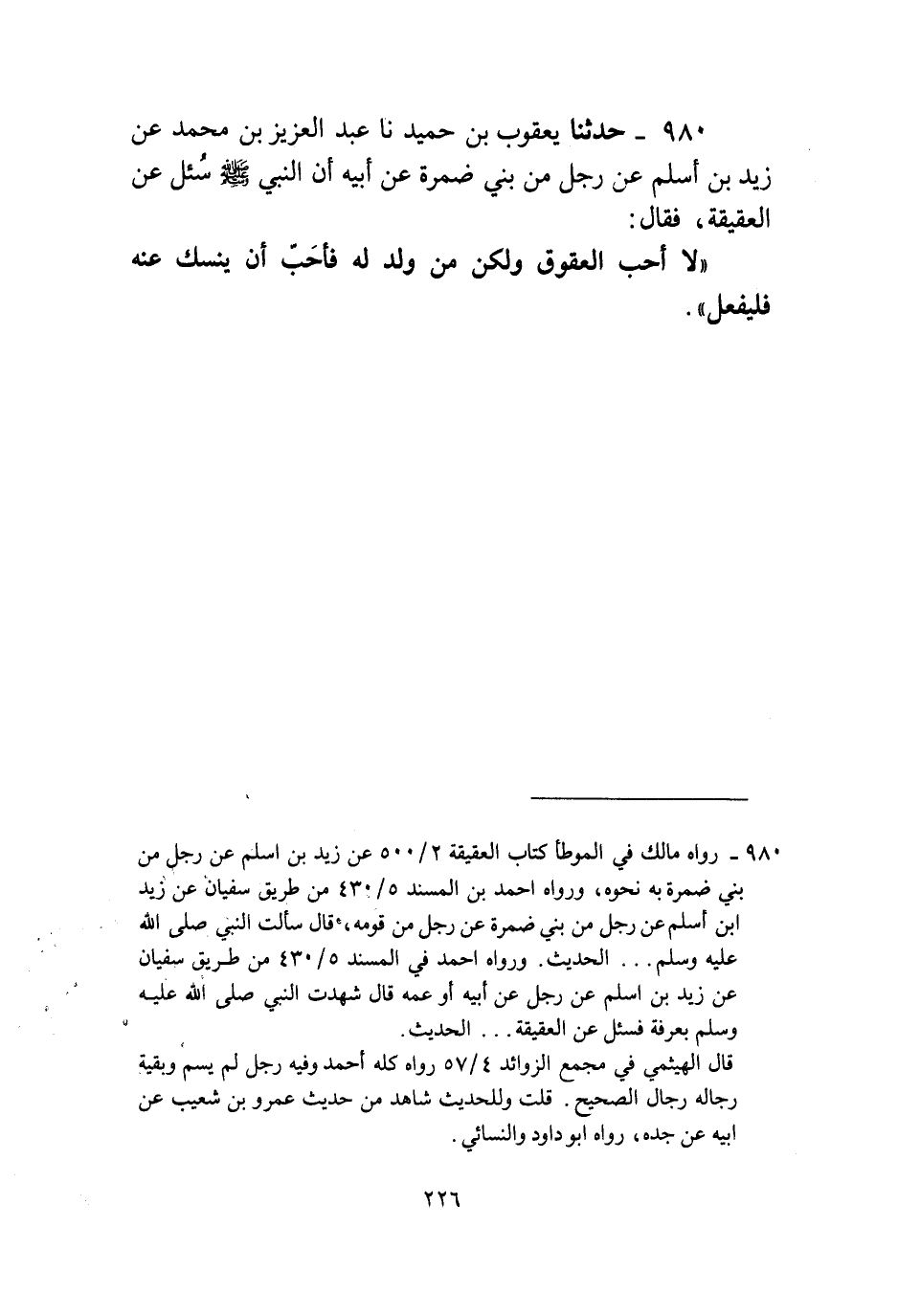 980 - حَدَّثَنَا يَعْقُوبُ بْنُ حُمَيْدٍ، نا عَبْدُ الْعَزِيزِ بْنُ مُحَمَّدٍ، عَنْ زَيْدِ بْنِ أَسْلَمَ، عَنْ رَجُلٍ مِنْ بَنِي ضَمْرَةَ، عَنْ أَبِيهِ، أَنَّ النَّبِيَّ صَلَّى اللهُ عَلَيْهِ وَسَلَّمَ سُئِلَ عَنِ الْعَقِيقَةِ، فَقَالَ: «§لَا أُحِبُّ الْعُقُوقَ، وَلَكِنْ مَنْ وُلِدَ لَهُ فَأَحَبَّ أَنْ يُنْسِكَ عَنْهُ فَلْيَفْعَلْ»